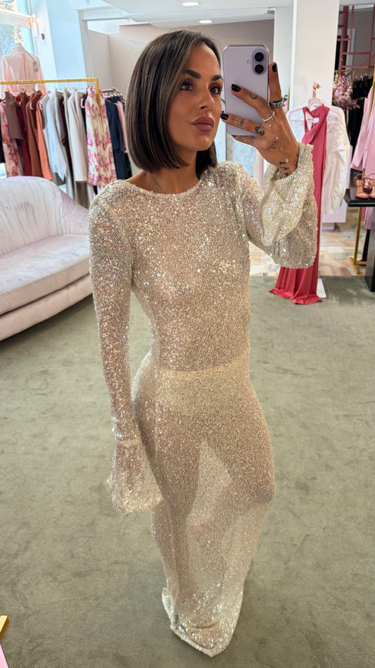 Abito lungo bianco sottoveste con ricami e collana crystal fr