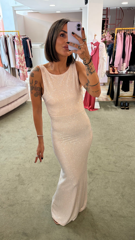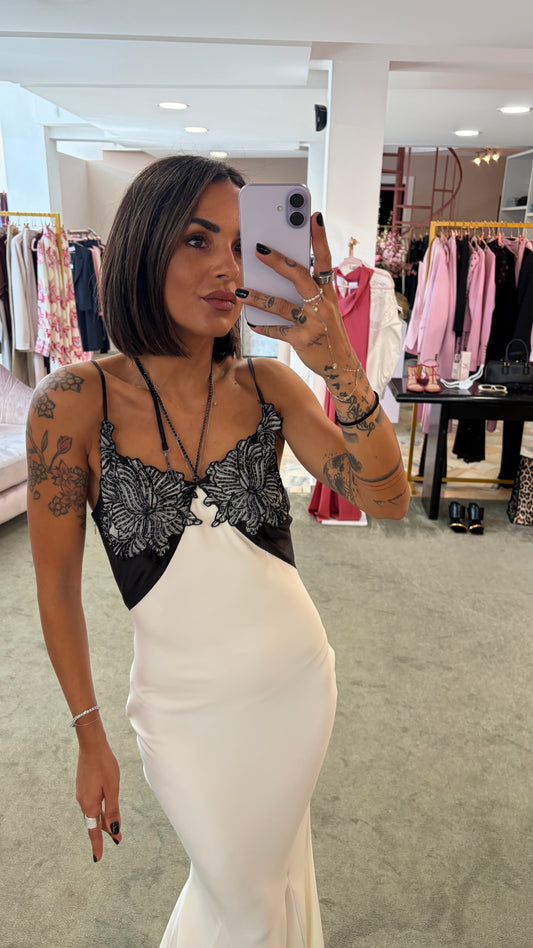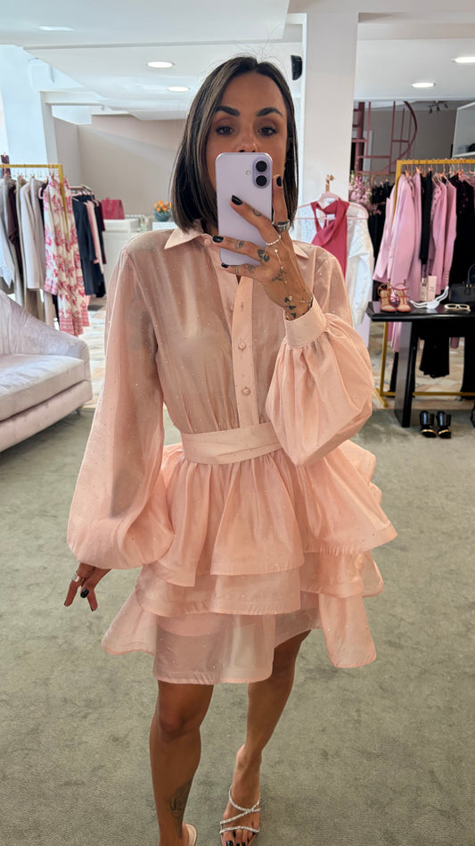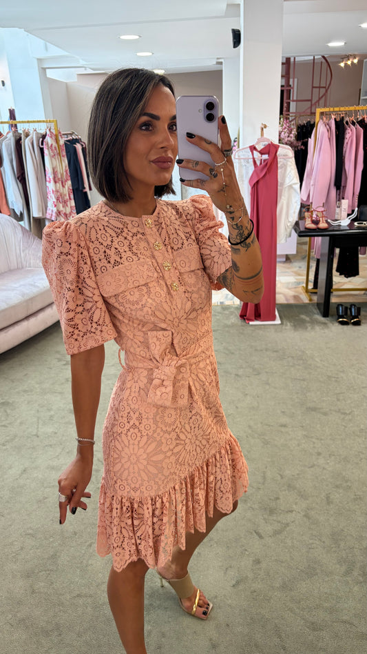 Abito rosa in pizzo manica corta e balza finale Actualee