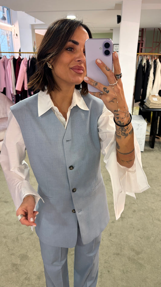 Gilet lungo azzurro effetto blazer con cinturina sl
