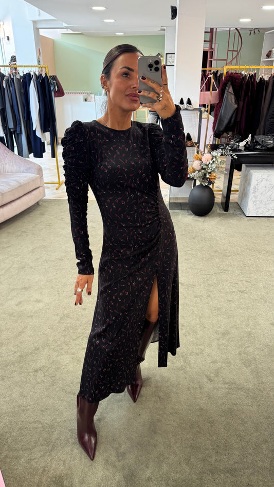 Abito chloe lungo MAR DE MARGARITAS nero con boccioli bordeaux