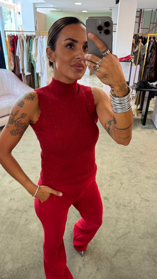 Lupetto smanicato rosso con cristalli a costine fr