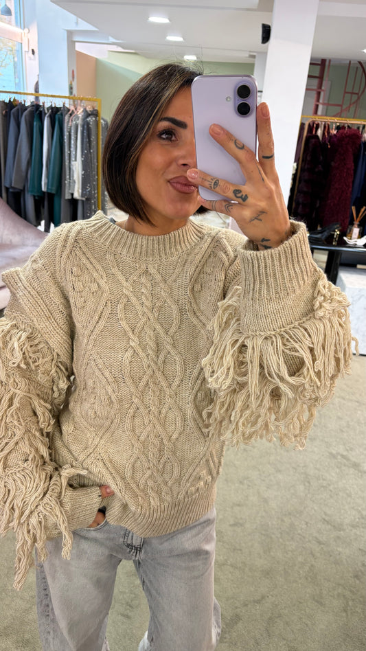 Maglione beige losanghe e manica con frange gl