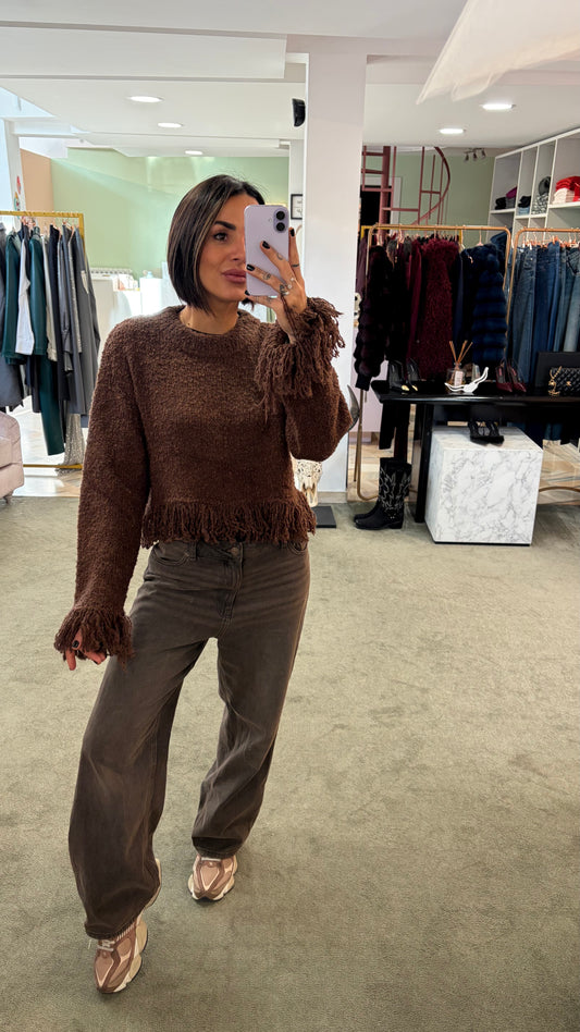 Maglione marrone crop con frange gl