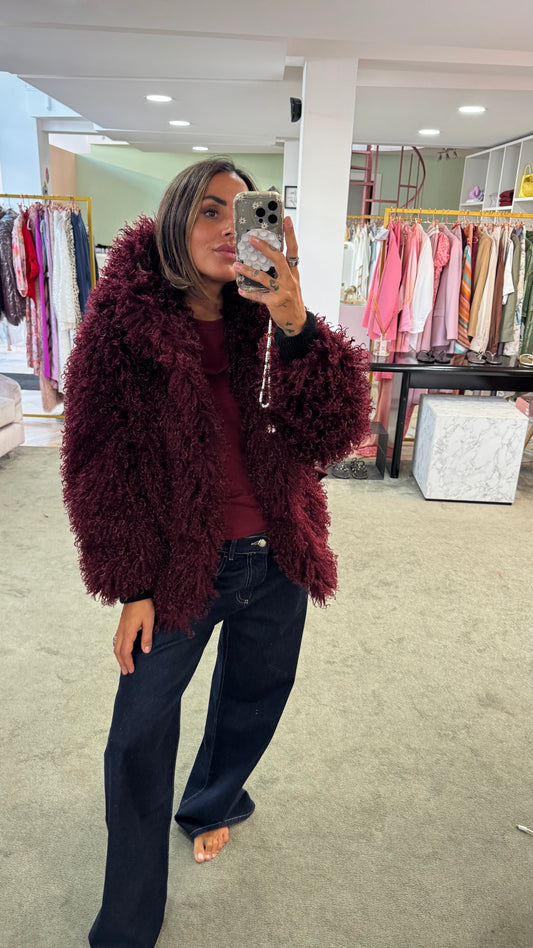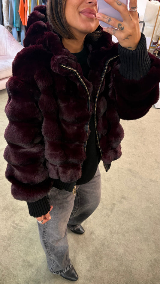 Bomber in pelliccia eco bordeaux luxury con cappuccio un