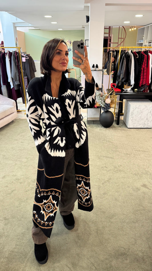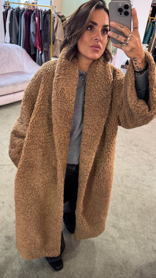 Cappotto/ Maxi cardigan nero lungo con collo in pelliccia eco