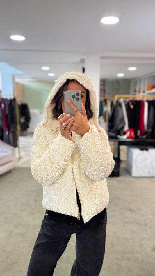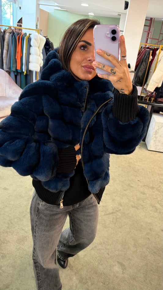 Bomber in pelliccia eco blu luxury con cappuccio un