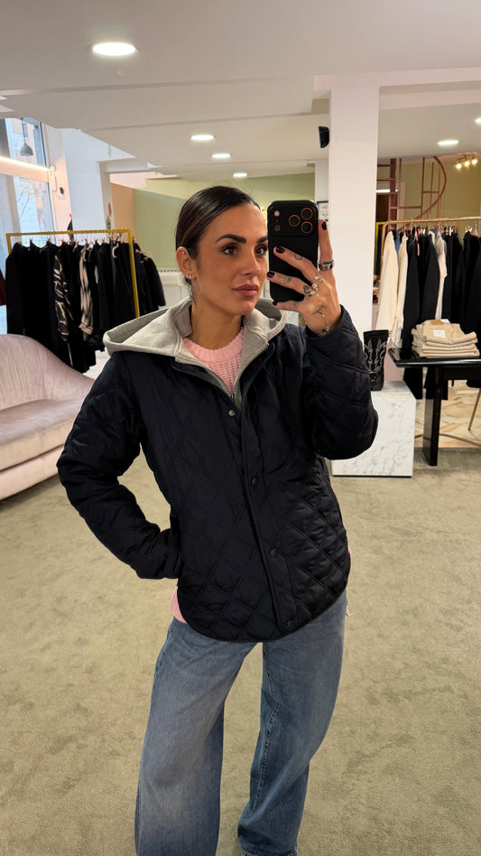 Piumino nero trapuntato con cappuccio in felpa sy