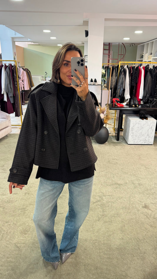 Cappotto caban tartan grigio e marrone corto jx