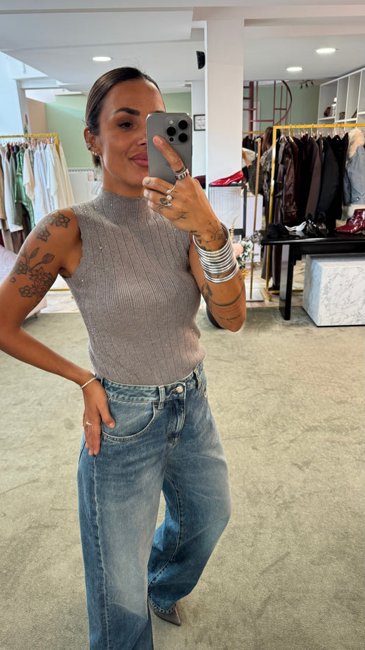 Lupetto smanicato grigio con cristalli a costine fr
