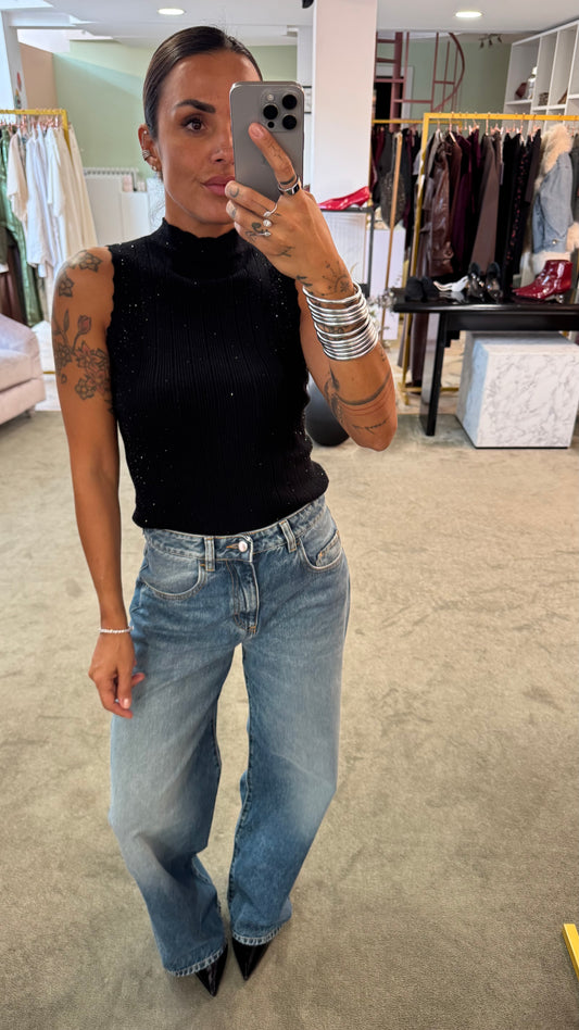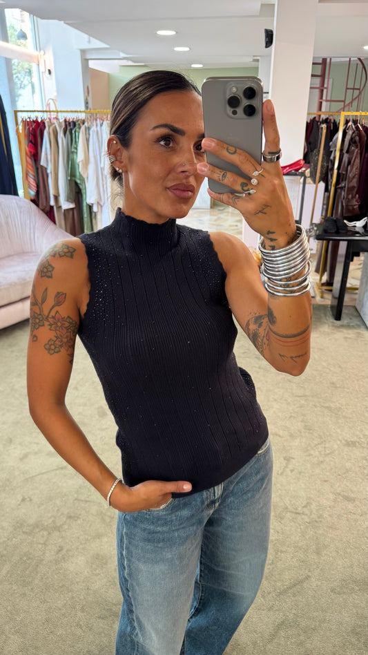 Lupetto smanicato nero con cristalli a costine fr