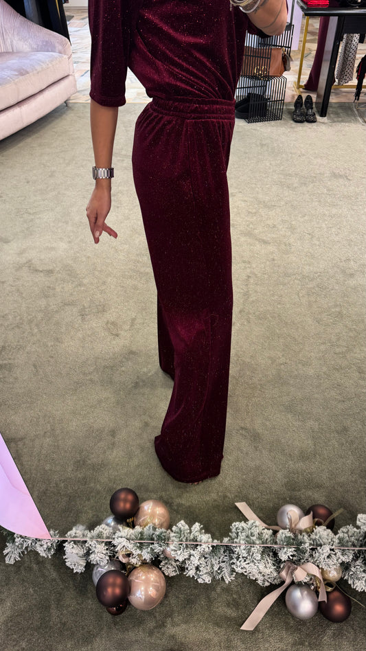 Pantaloni bordeaux glitter in ciniglia a palazzo