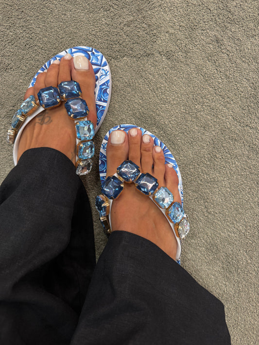 Ciabattina infradito in gomma azzurra con maioliche e pietre