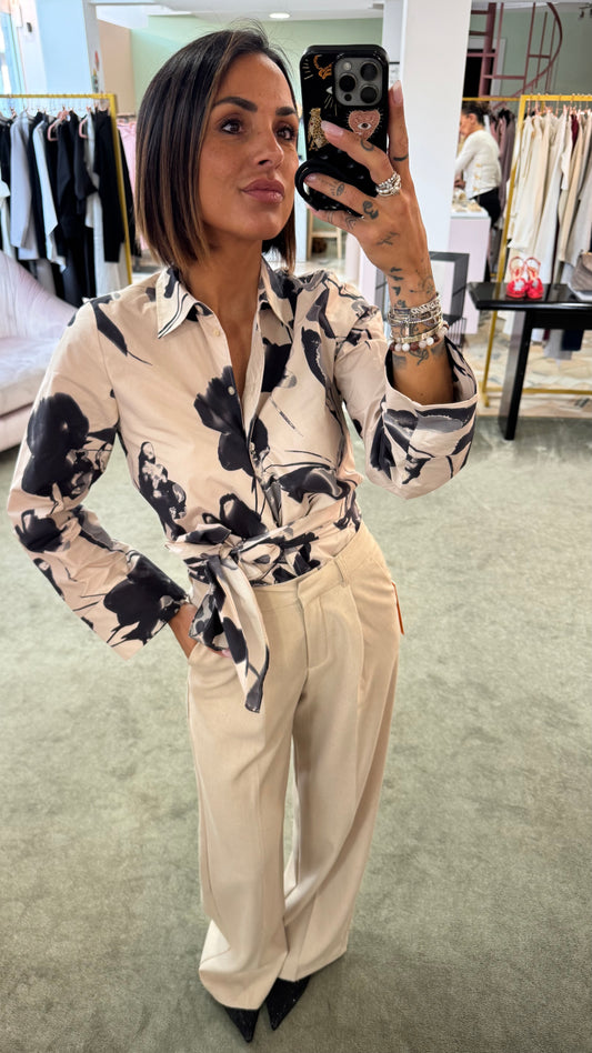 Camicia beige con fiori neri a portafoglio sl