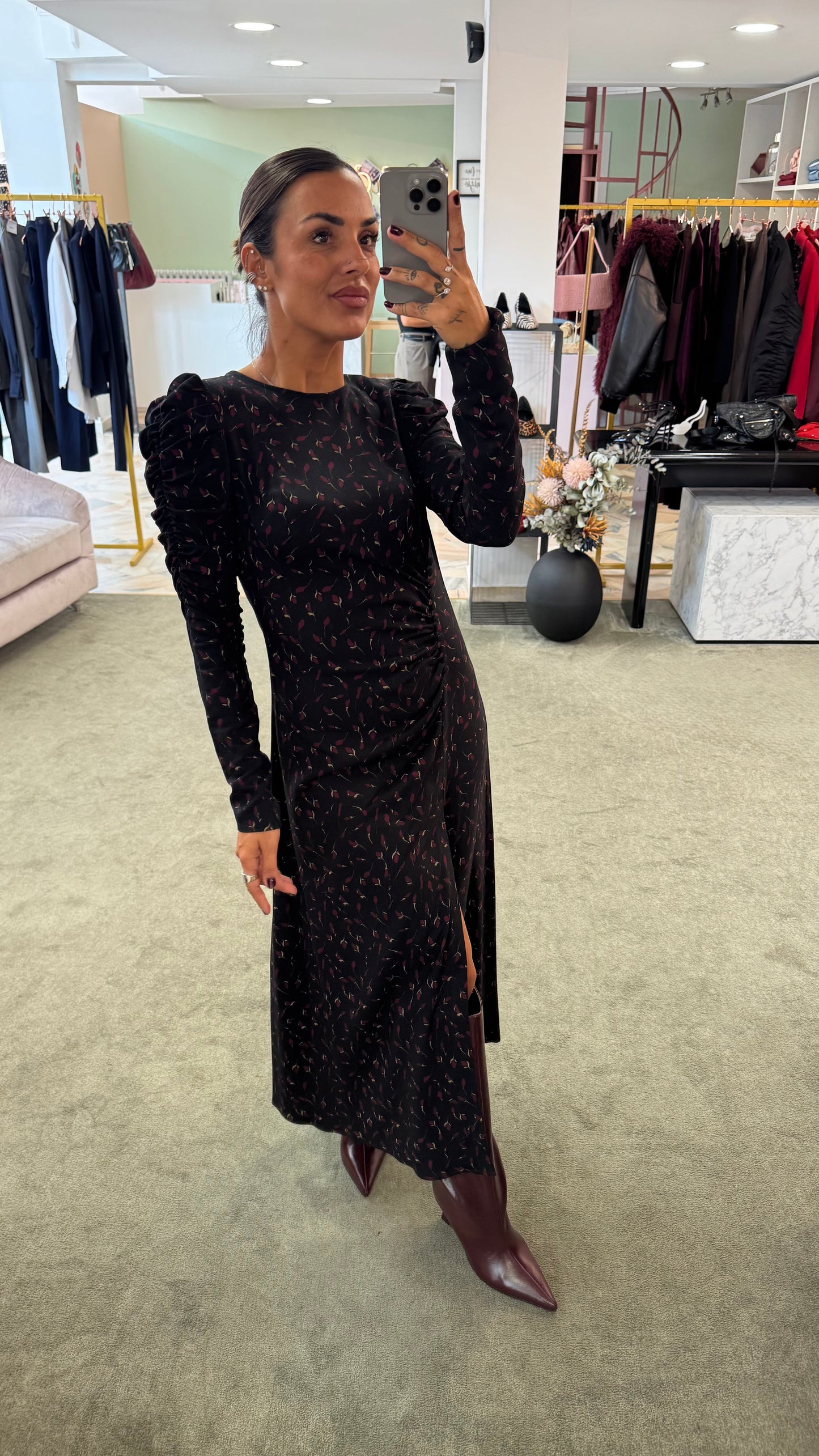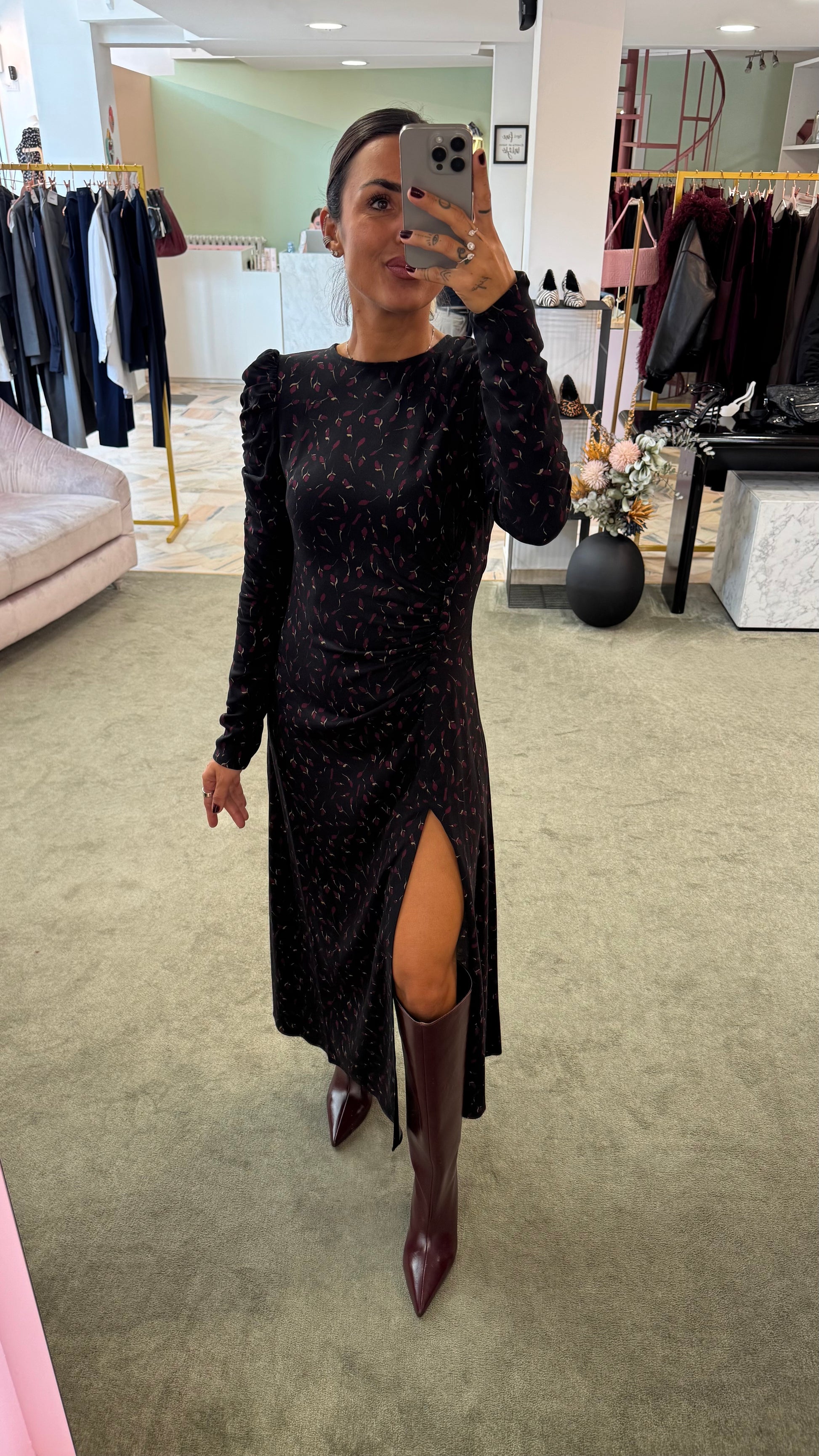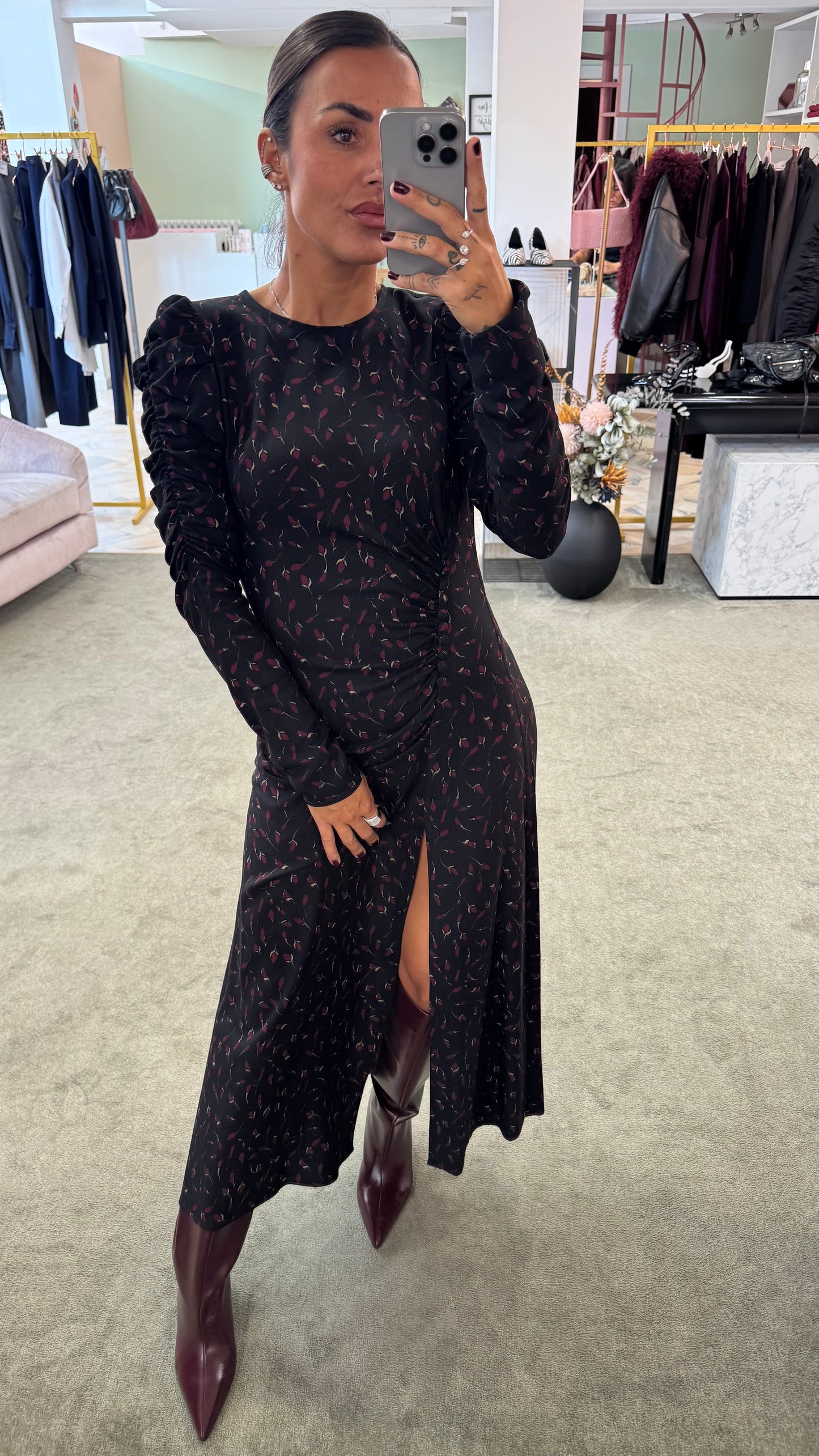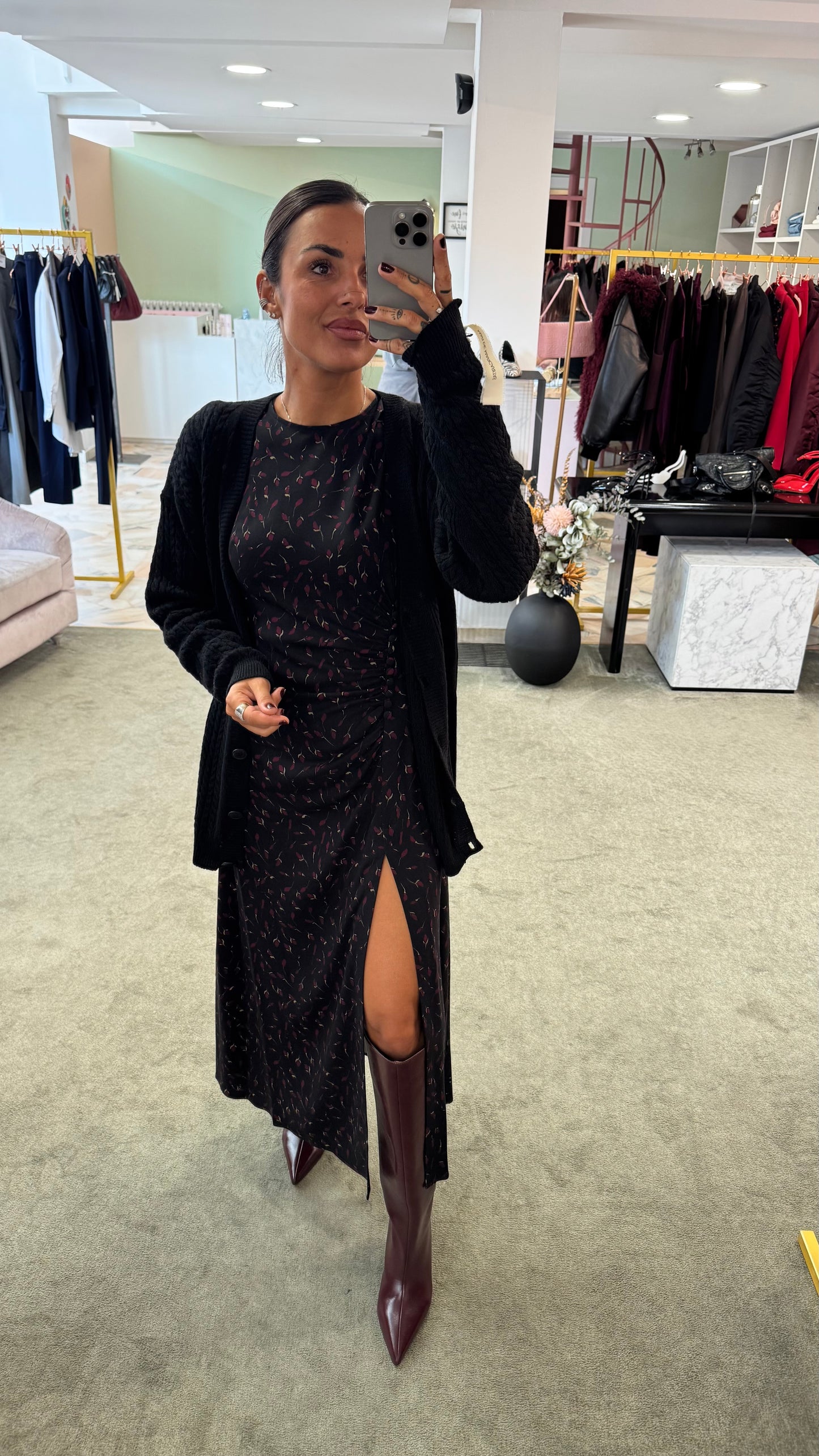 Abito chloe lungo MAR DE MARGARITAS nero con boccioli bordeaux