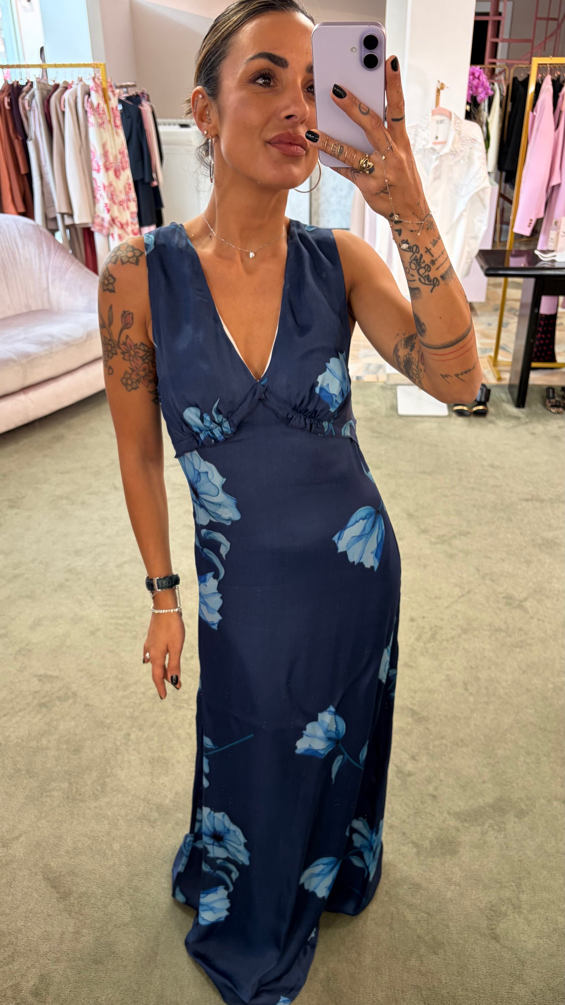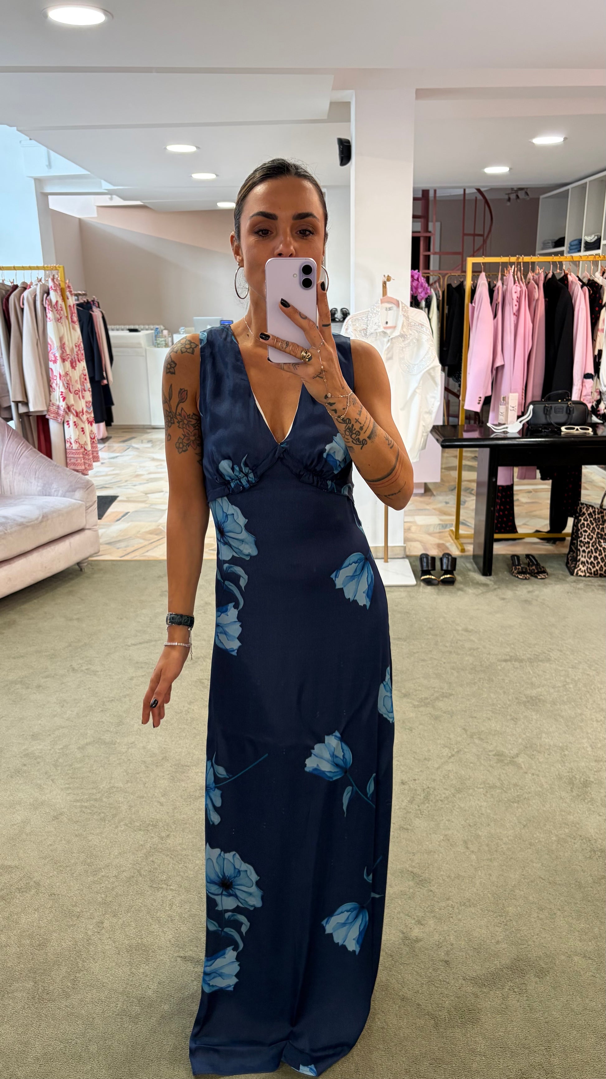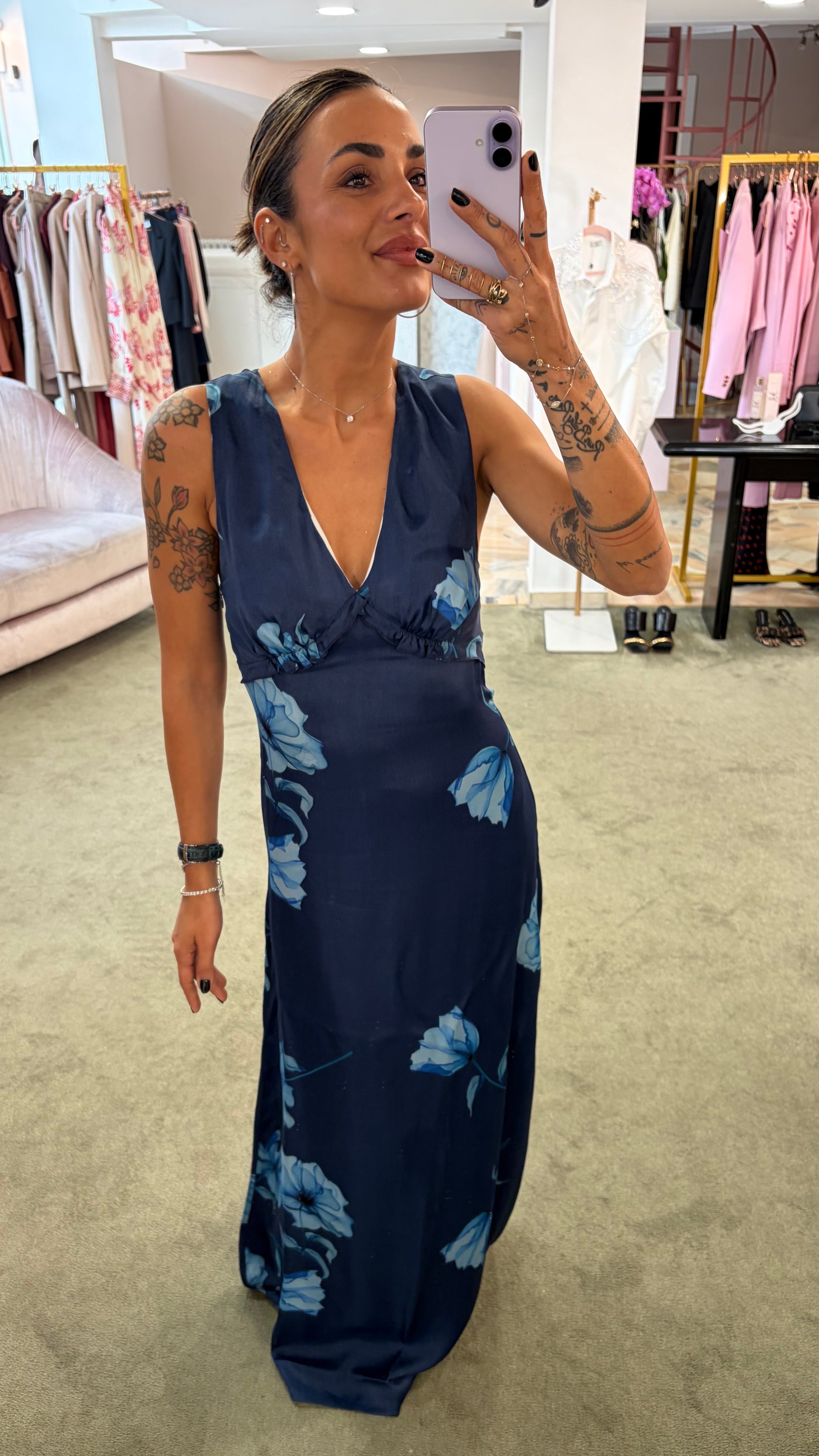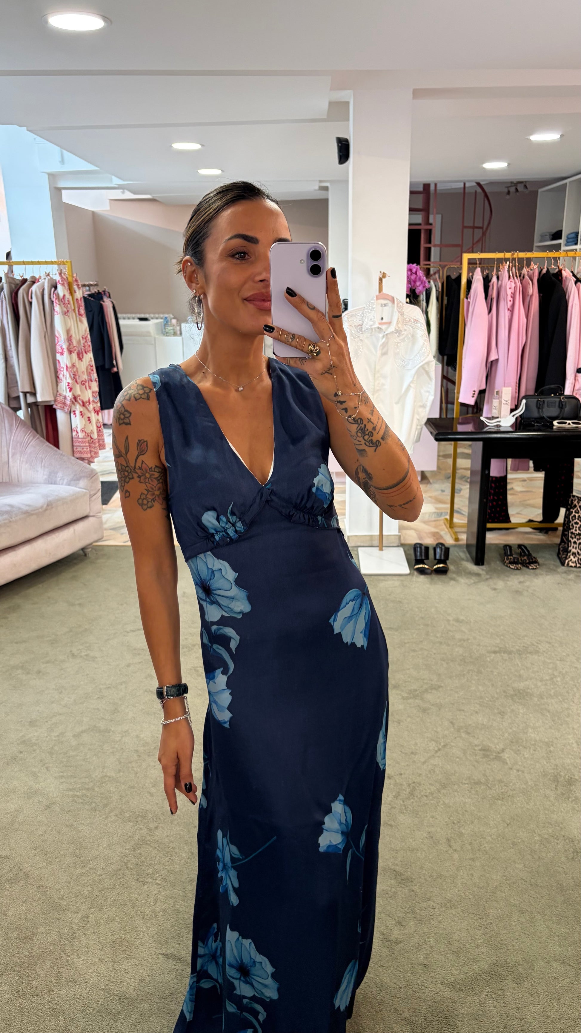 Abito ines lungo MAR DE MARGARITAS blu con fiori azzurri