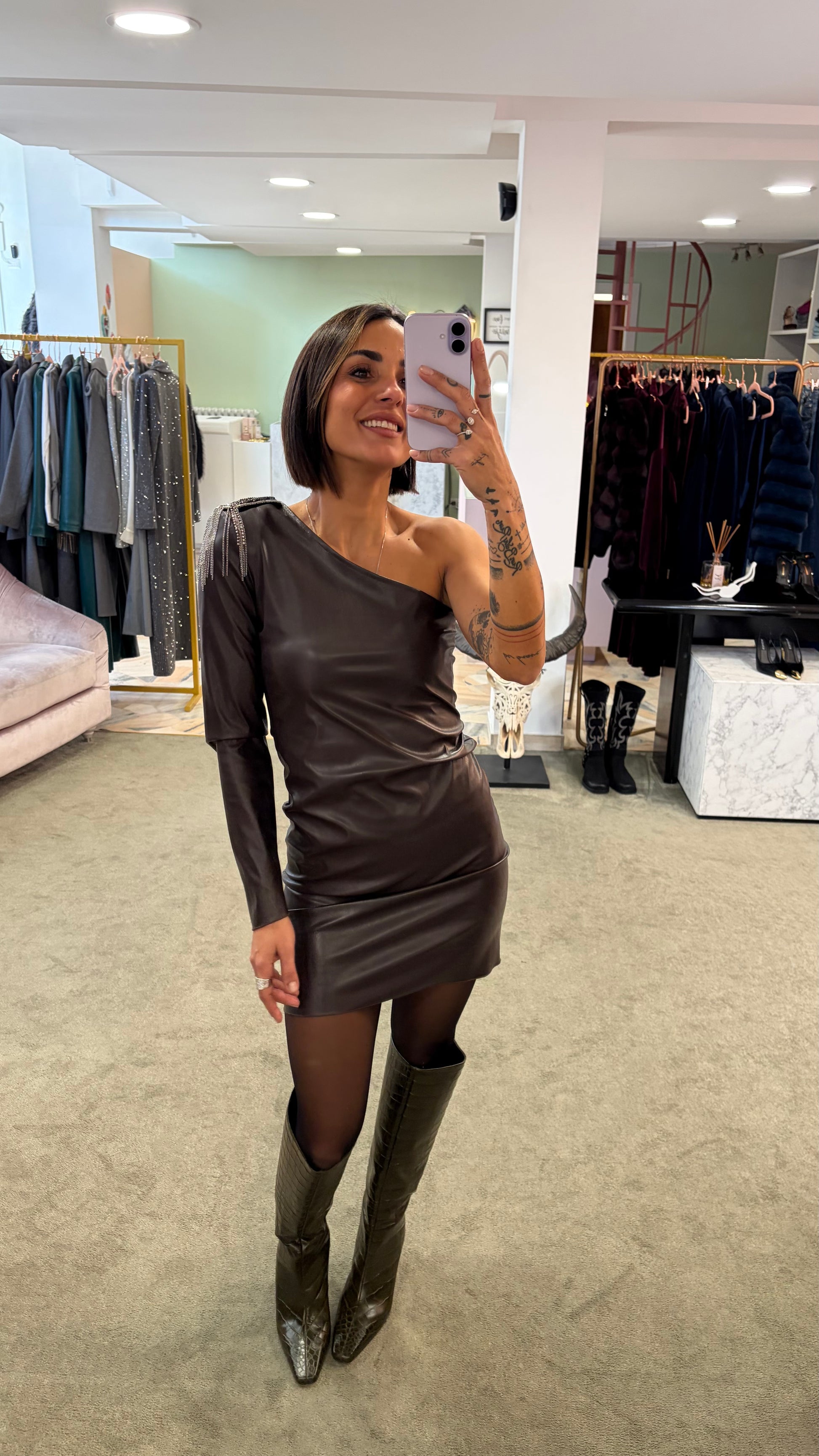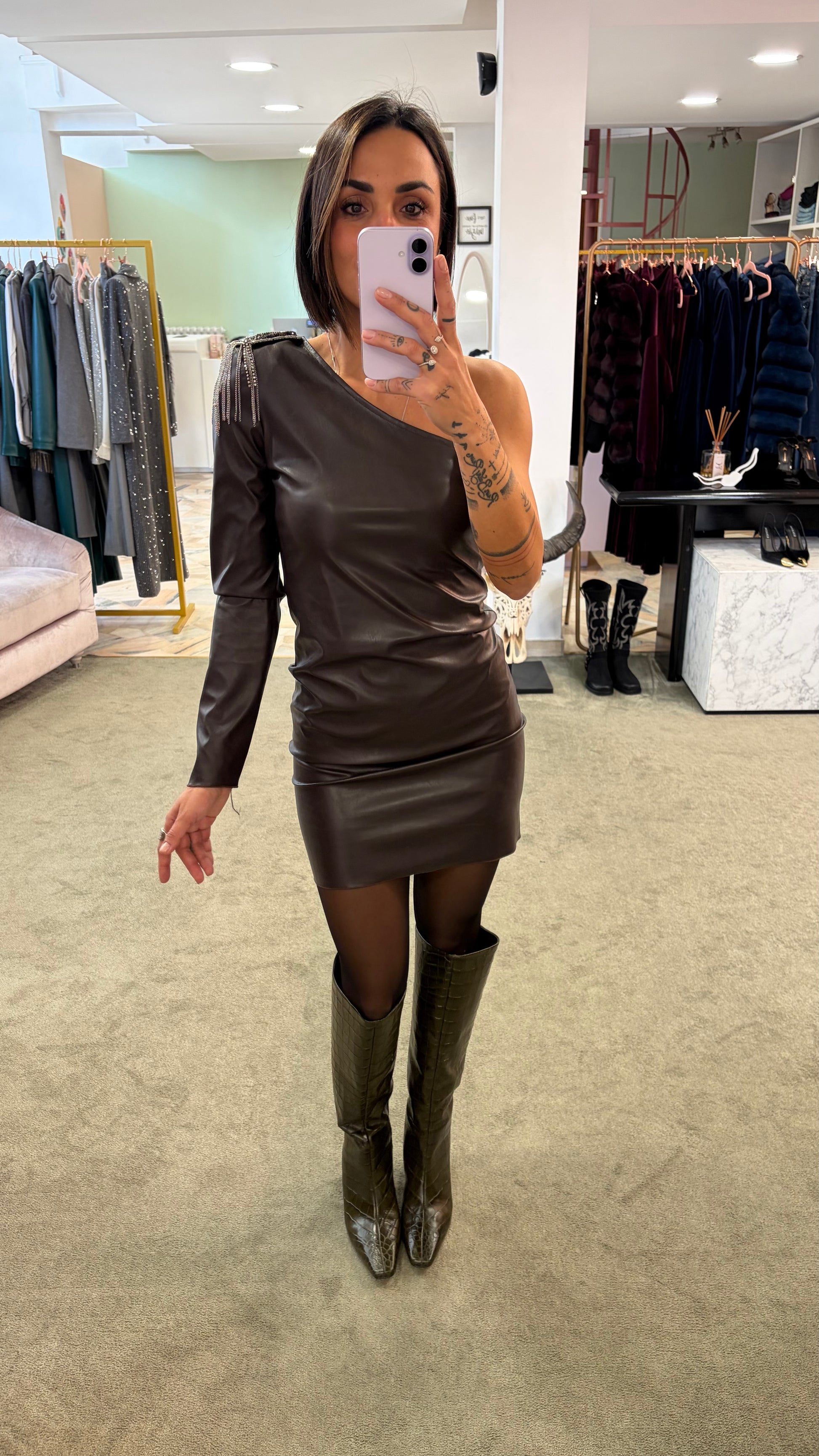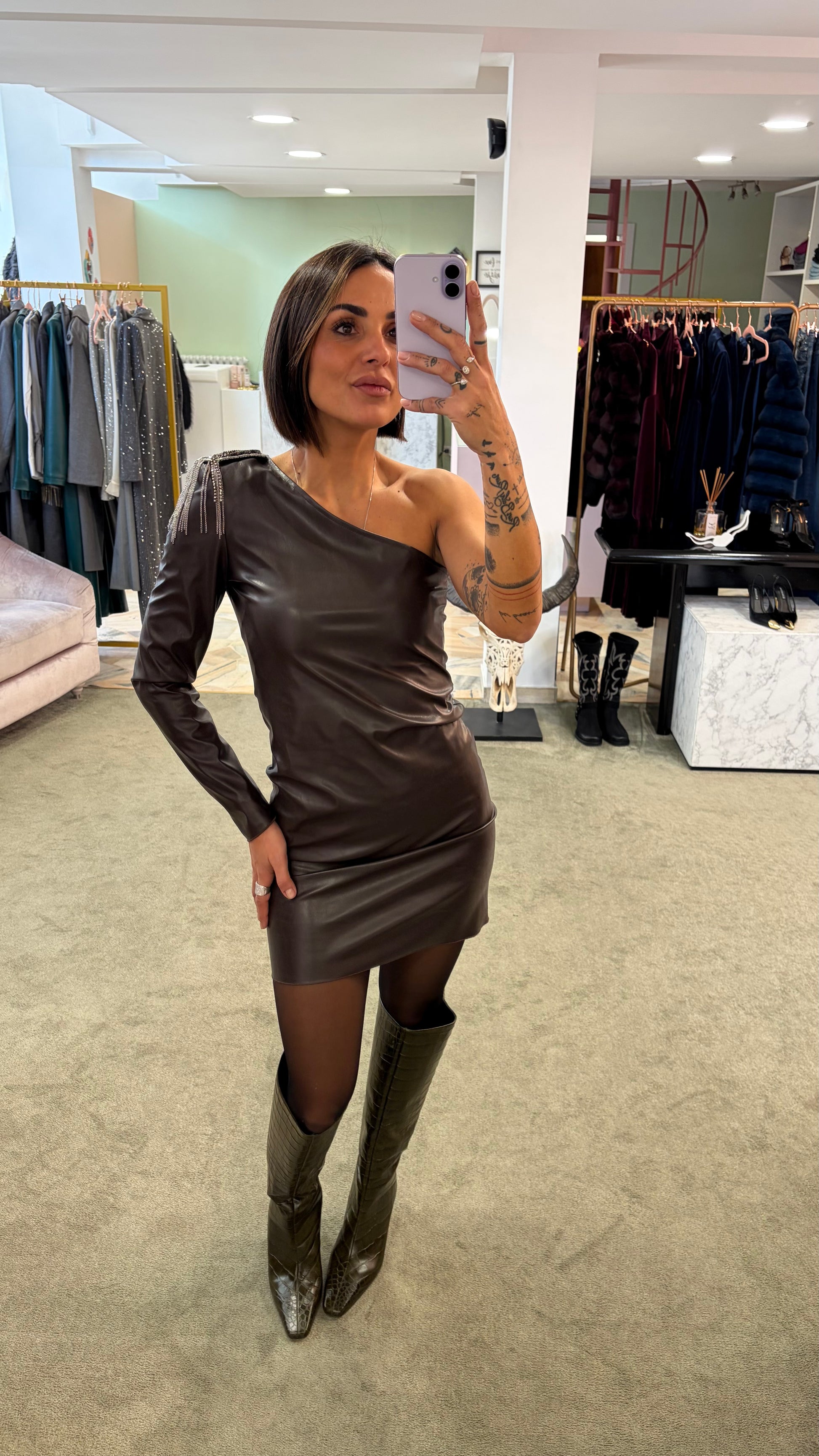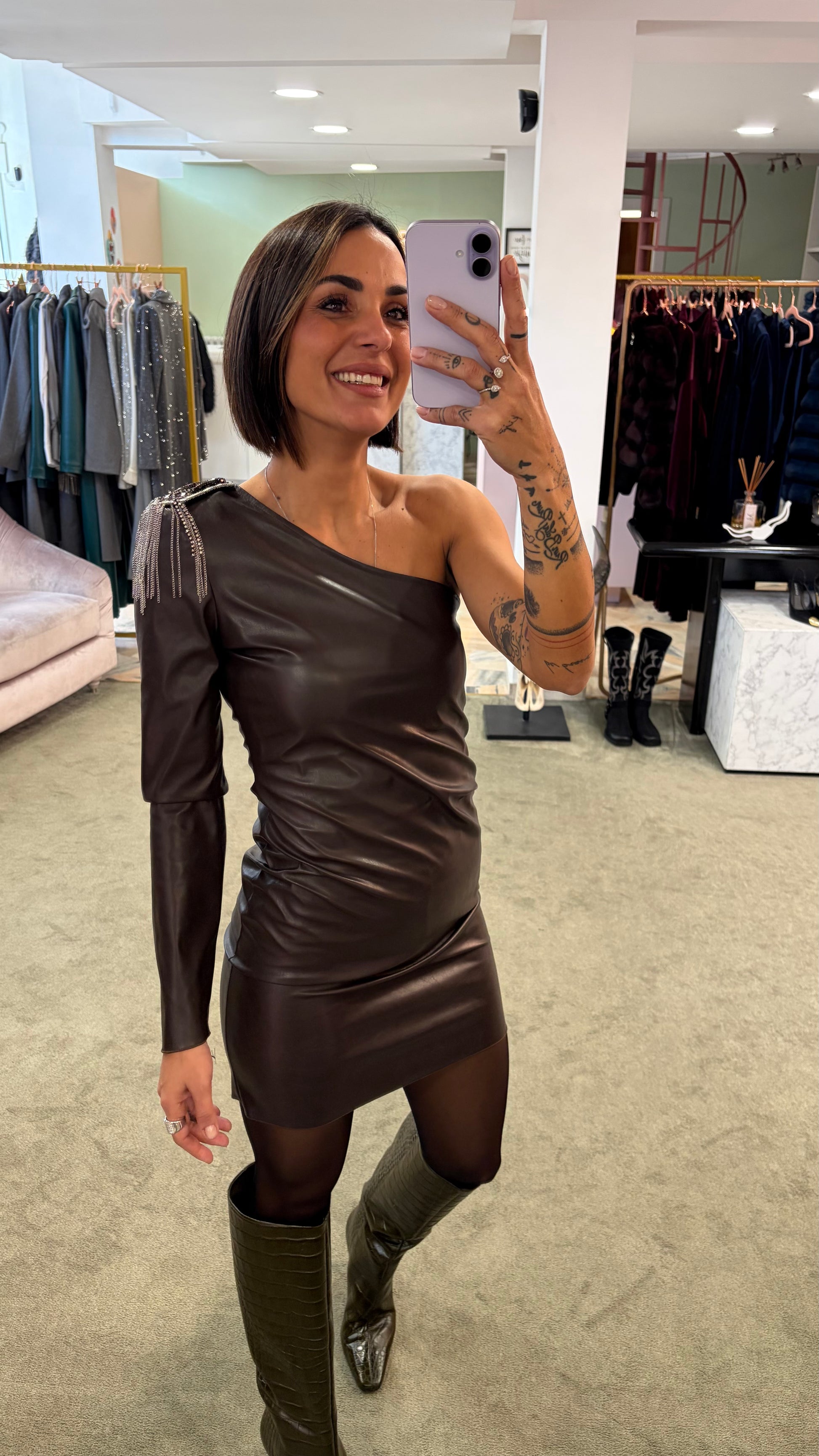 Abito monospalla marrone fango in ecopelle con dettaglio gioiello mq