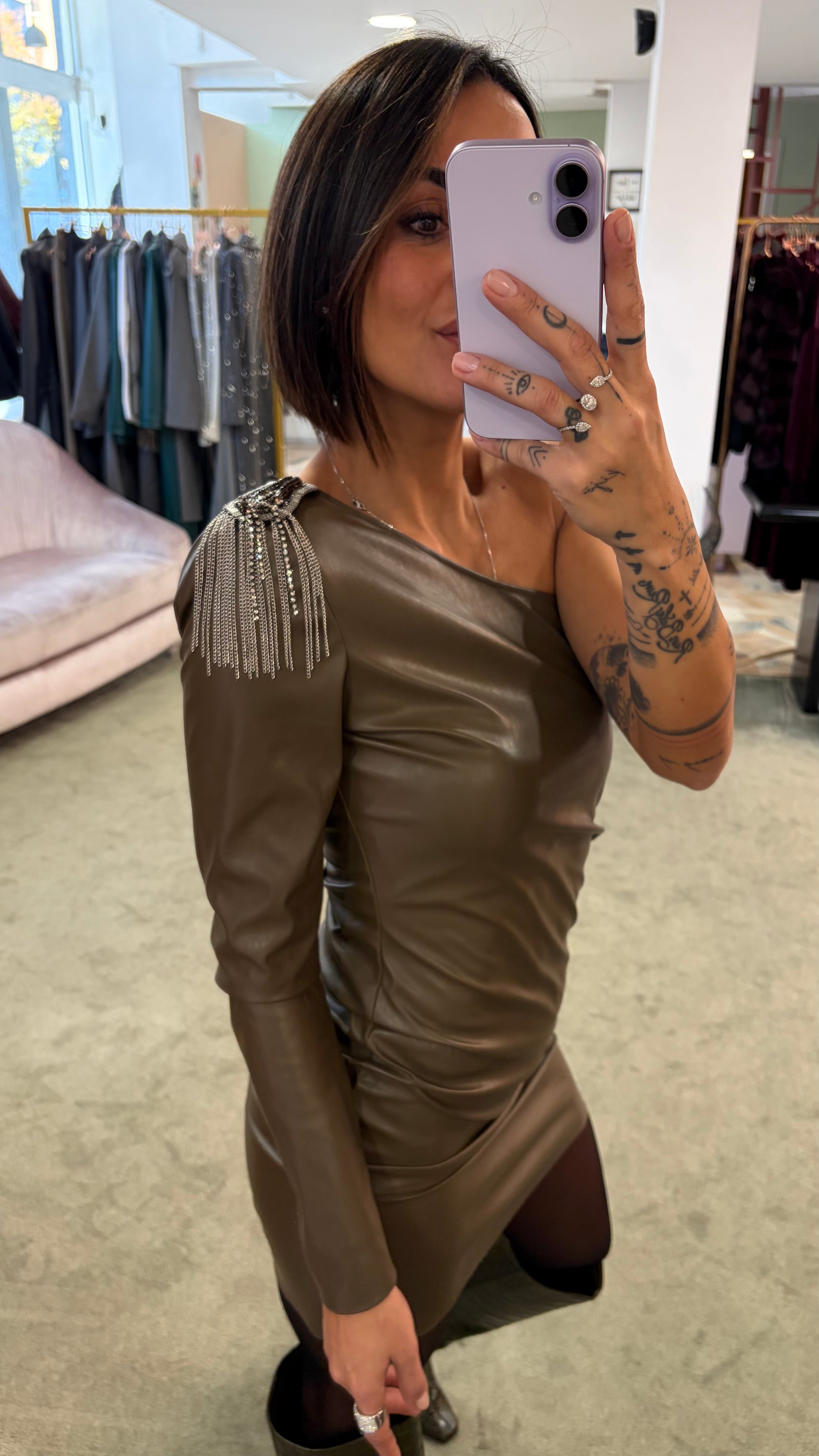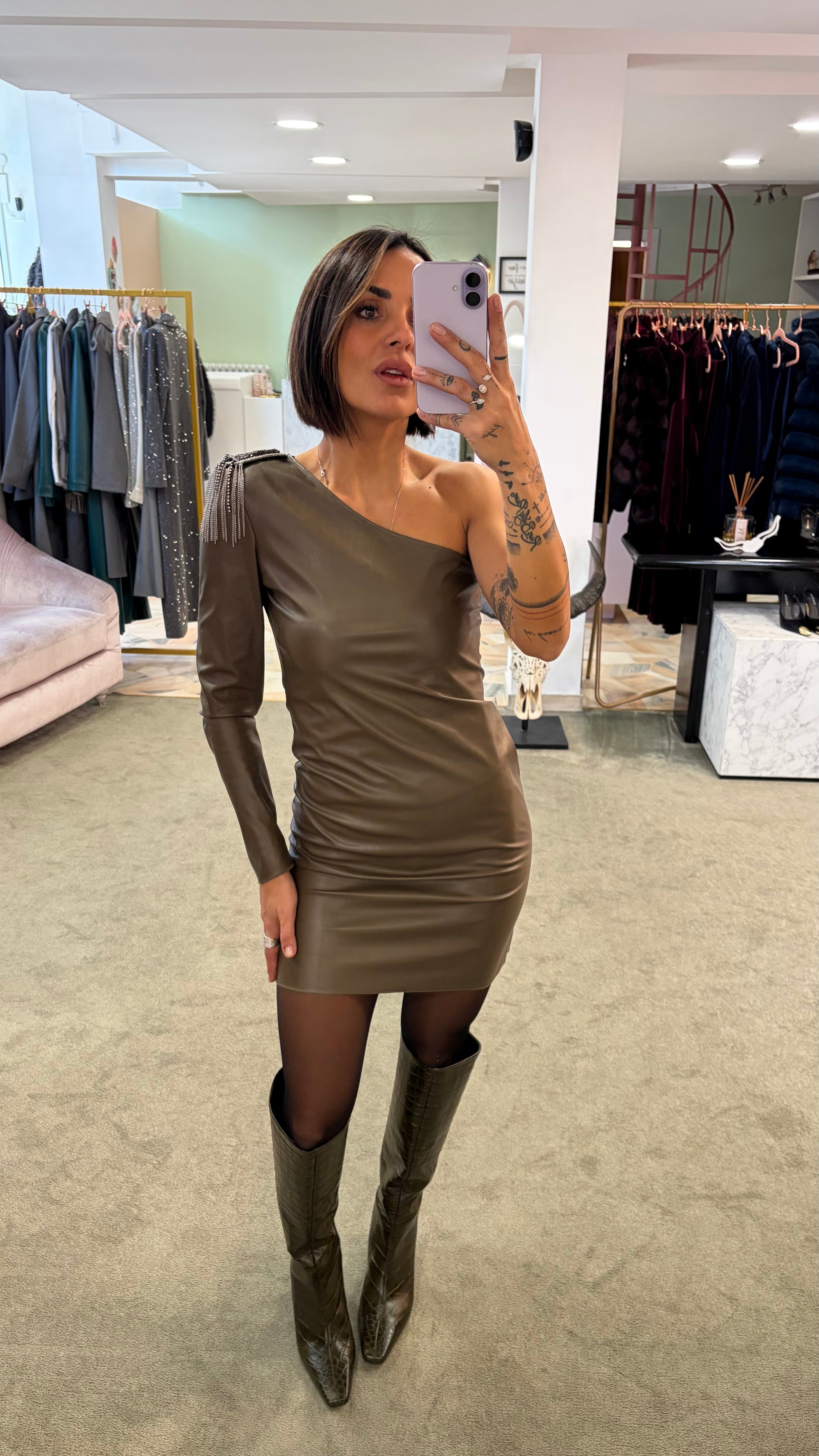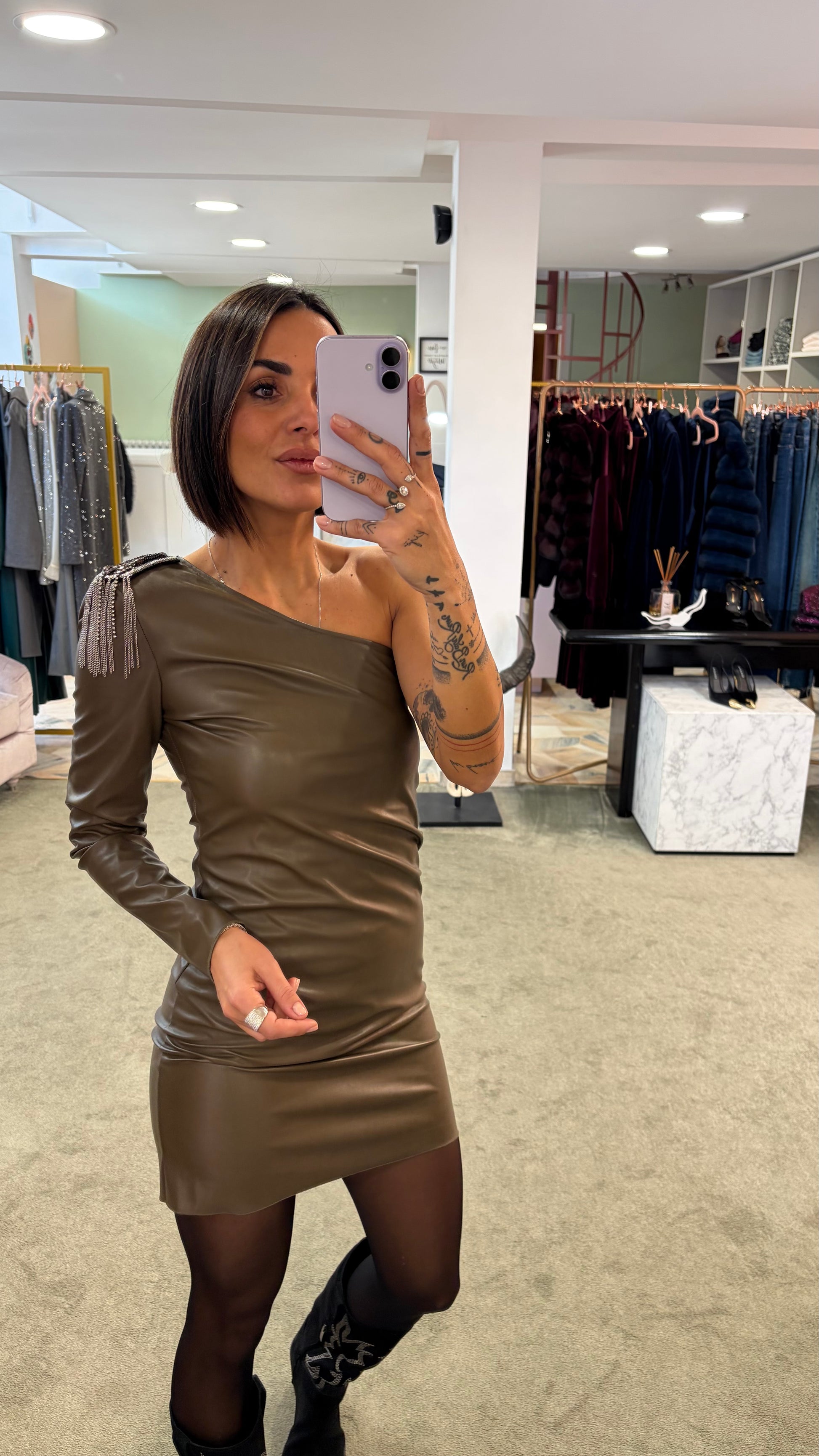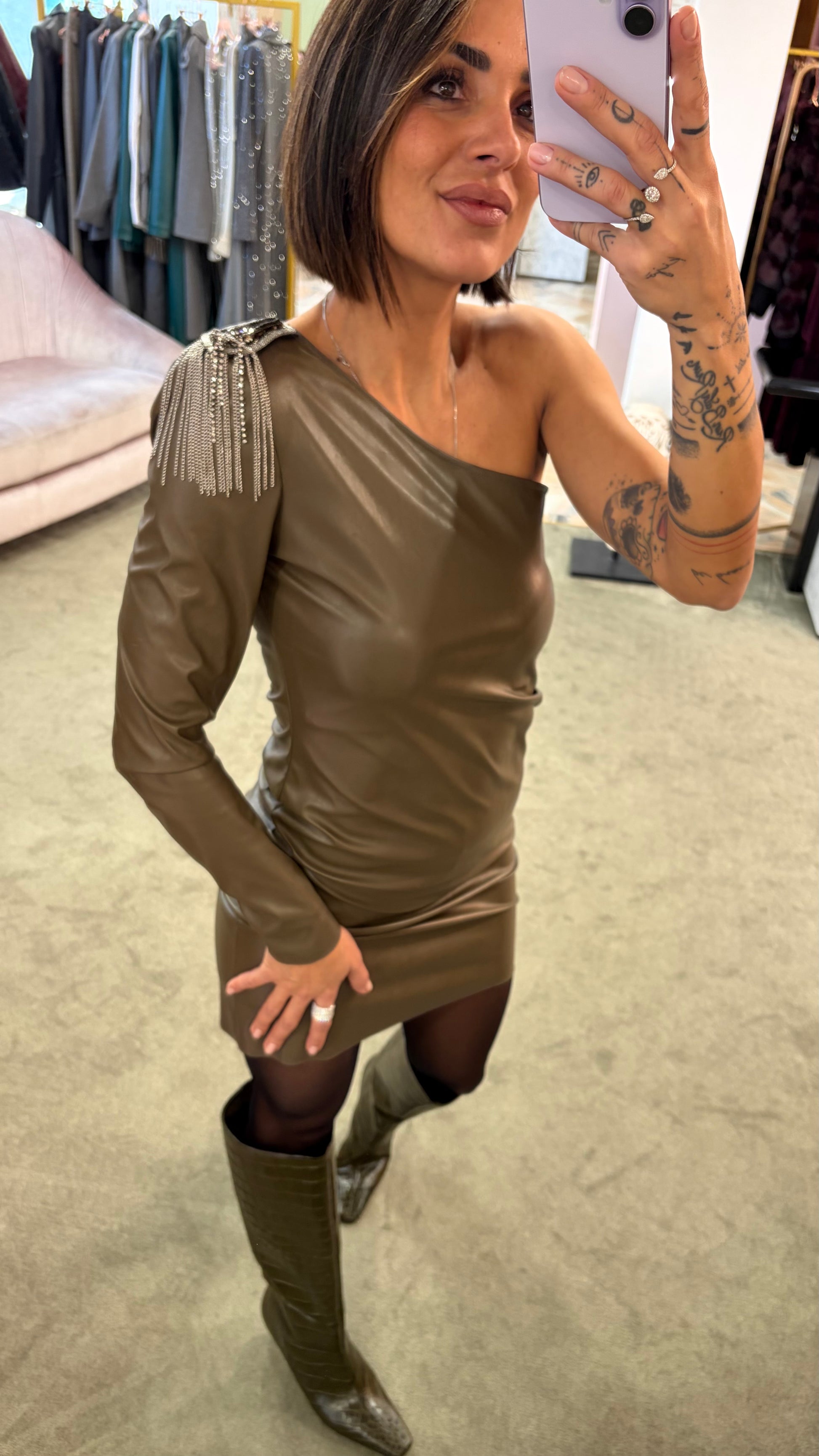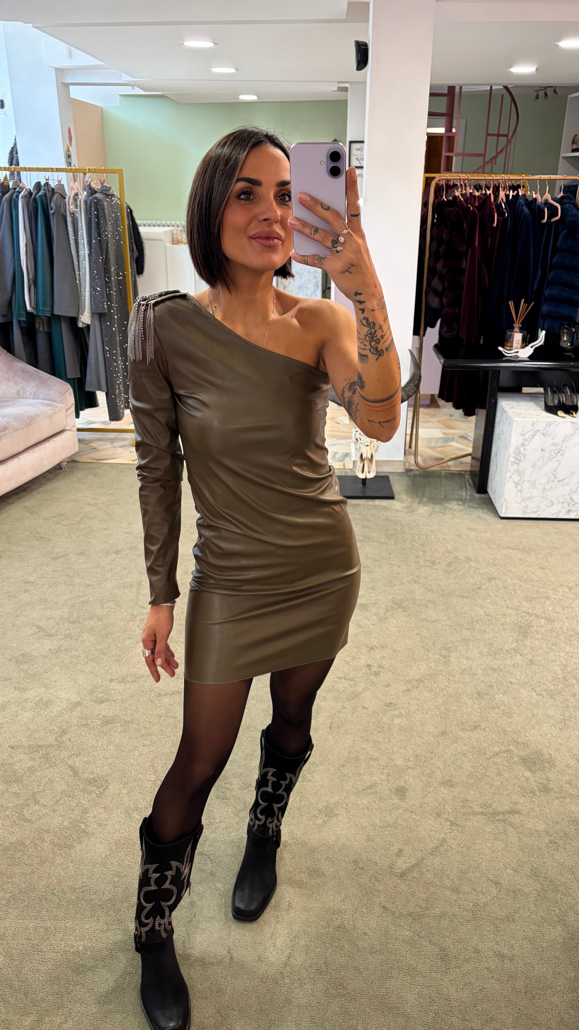 Abito monospalla verde oliva in ecopelle con dettaglio gioiello mq