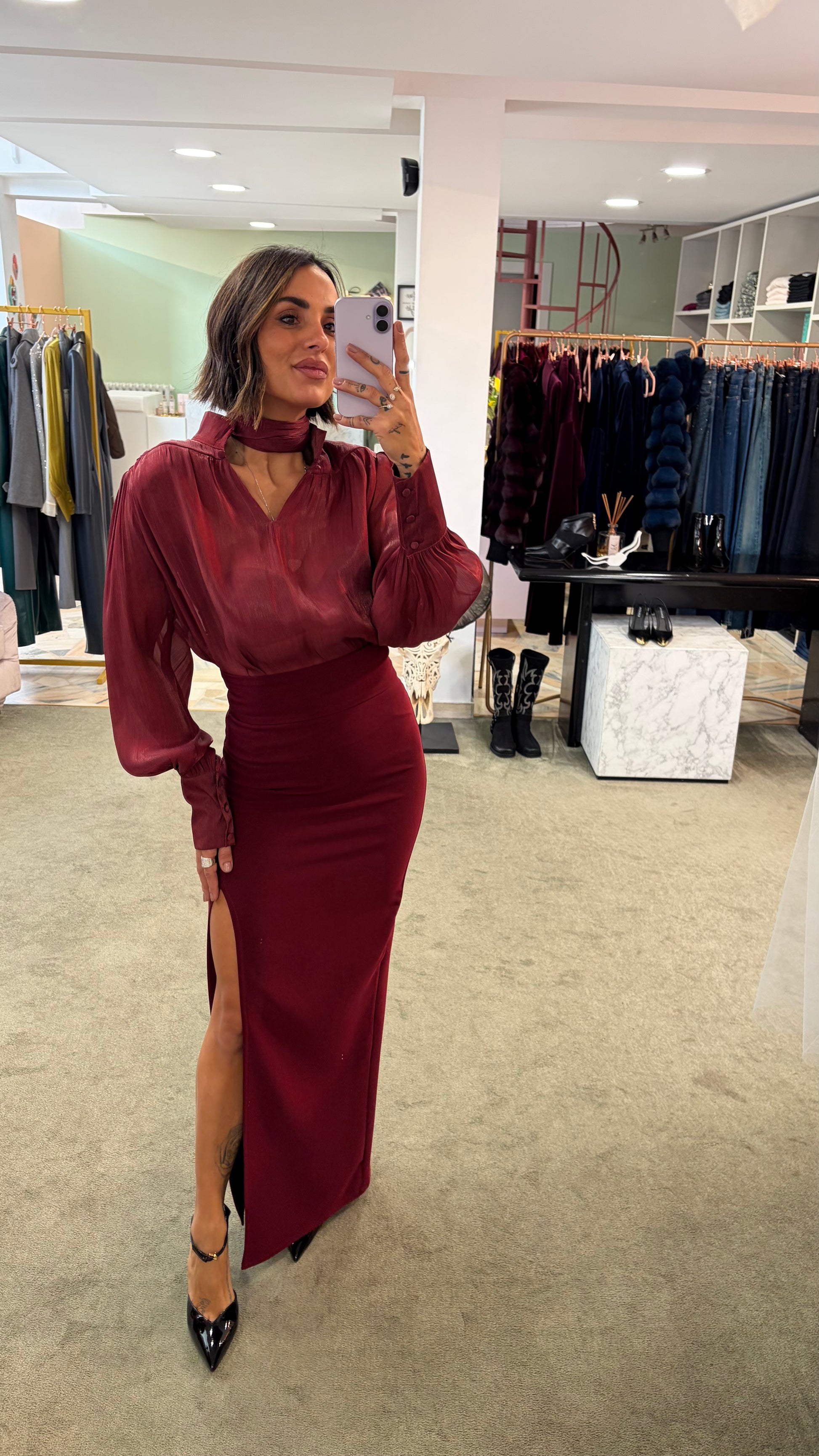 Vestibilità: regolare, effetto satin, con spallotte, manica palloncino e sciarpina