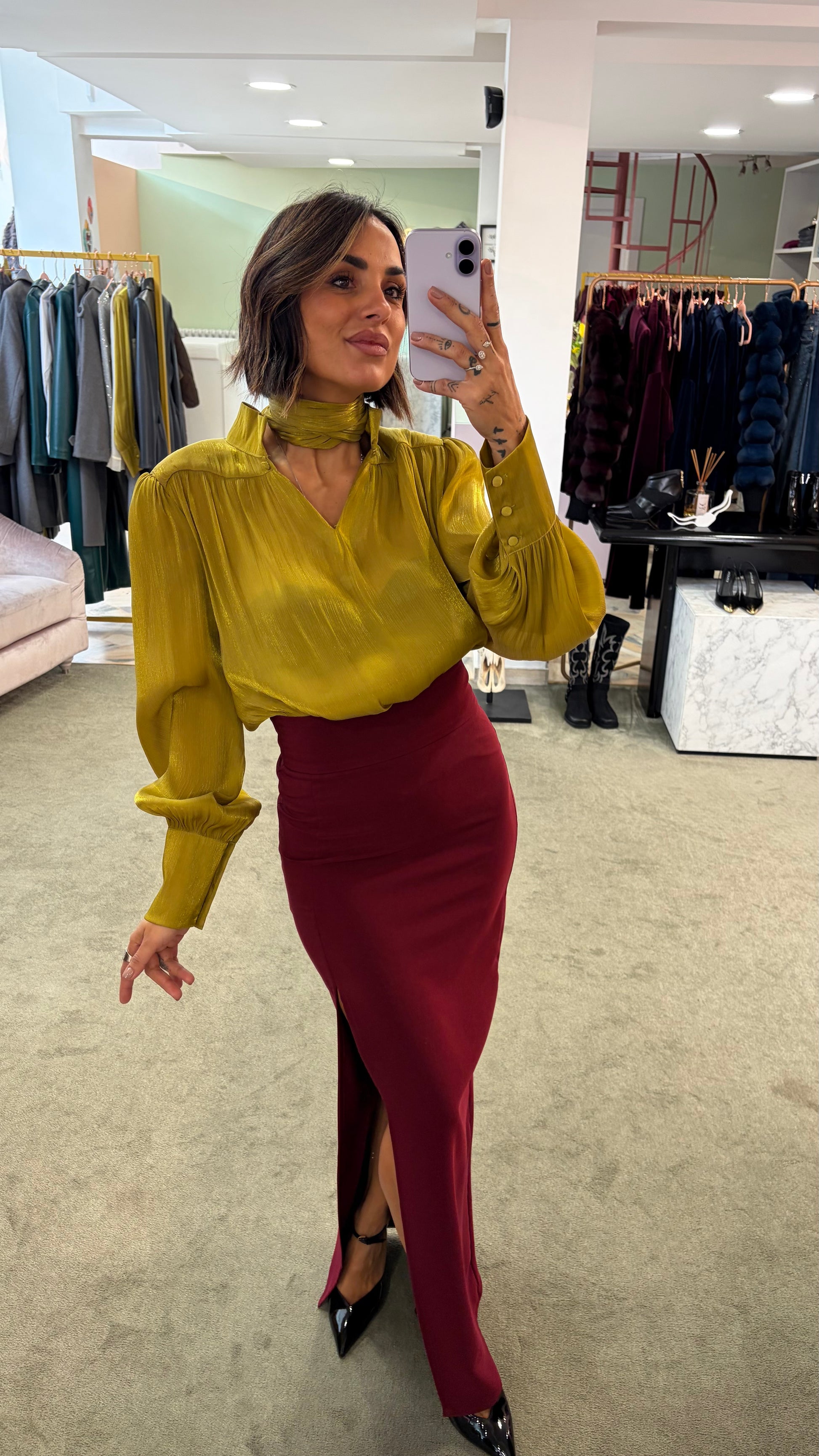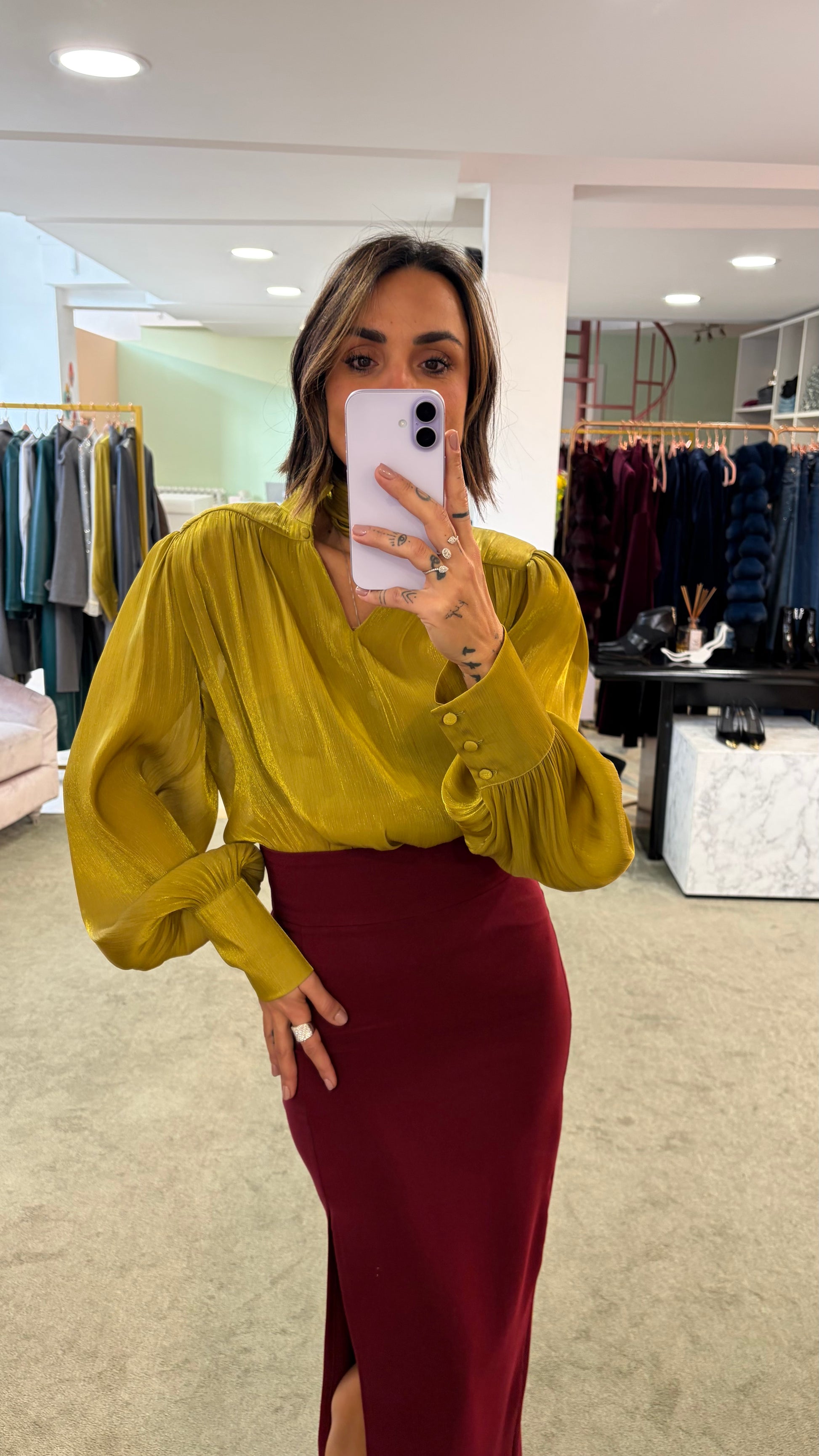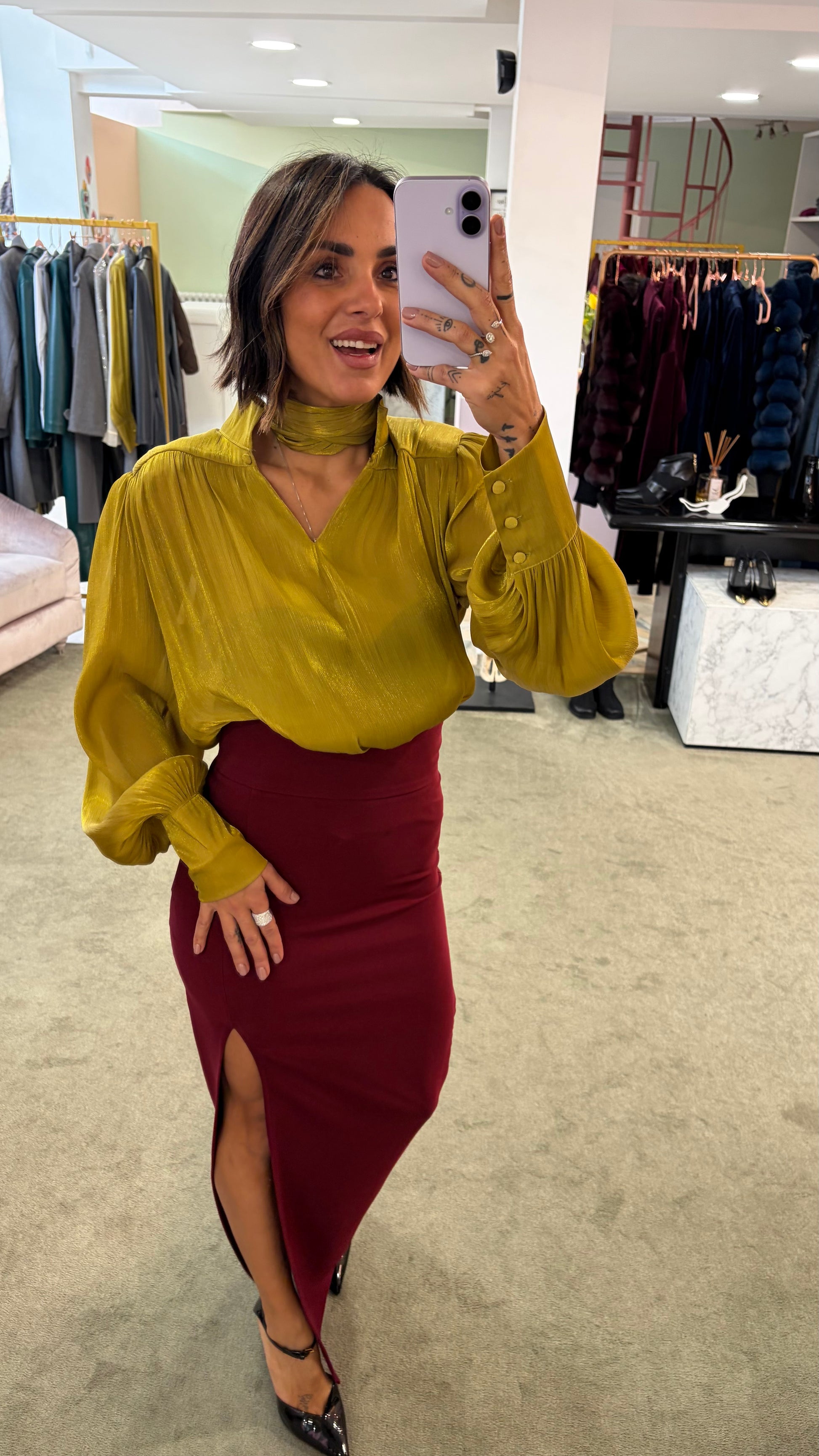 Vestibilità: regolare, effetto satin, con spallotte, manica palloncino e sciarpina