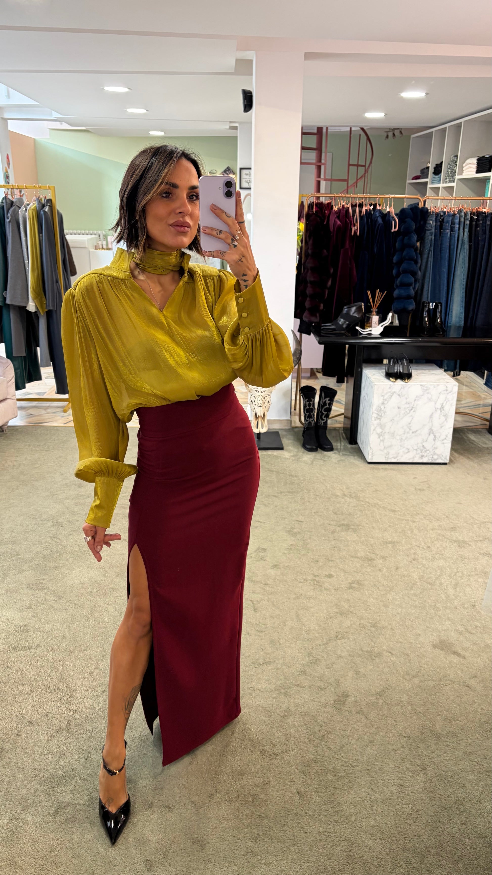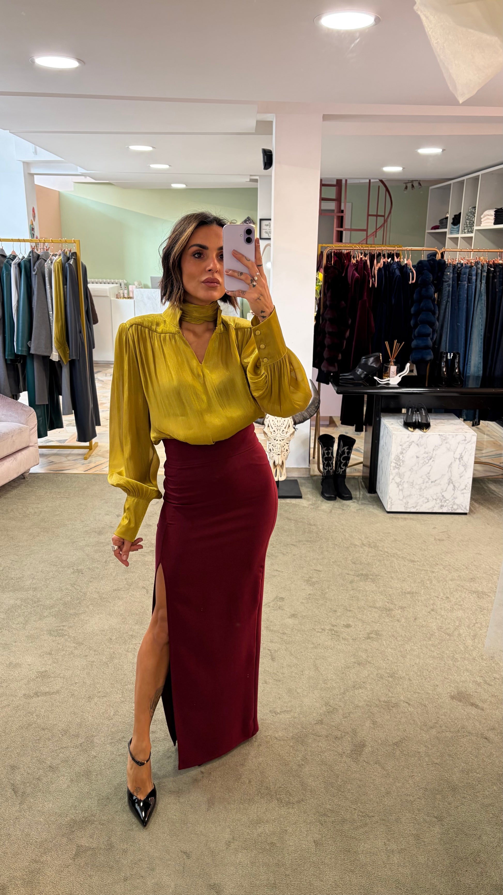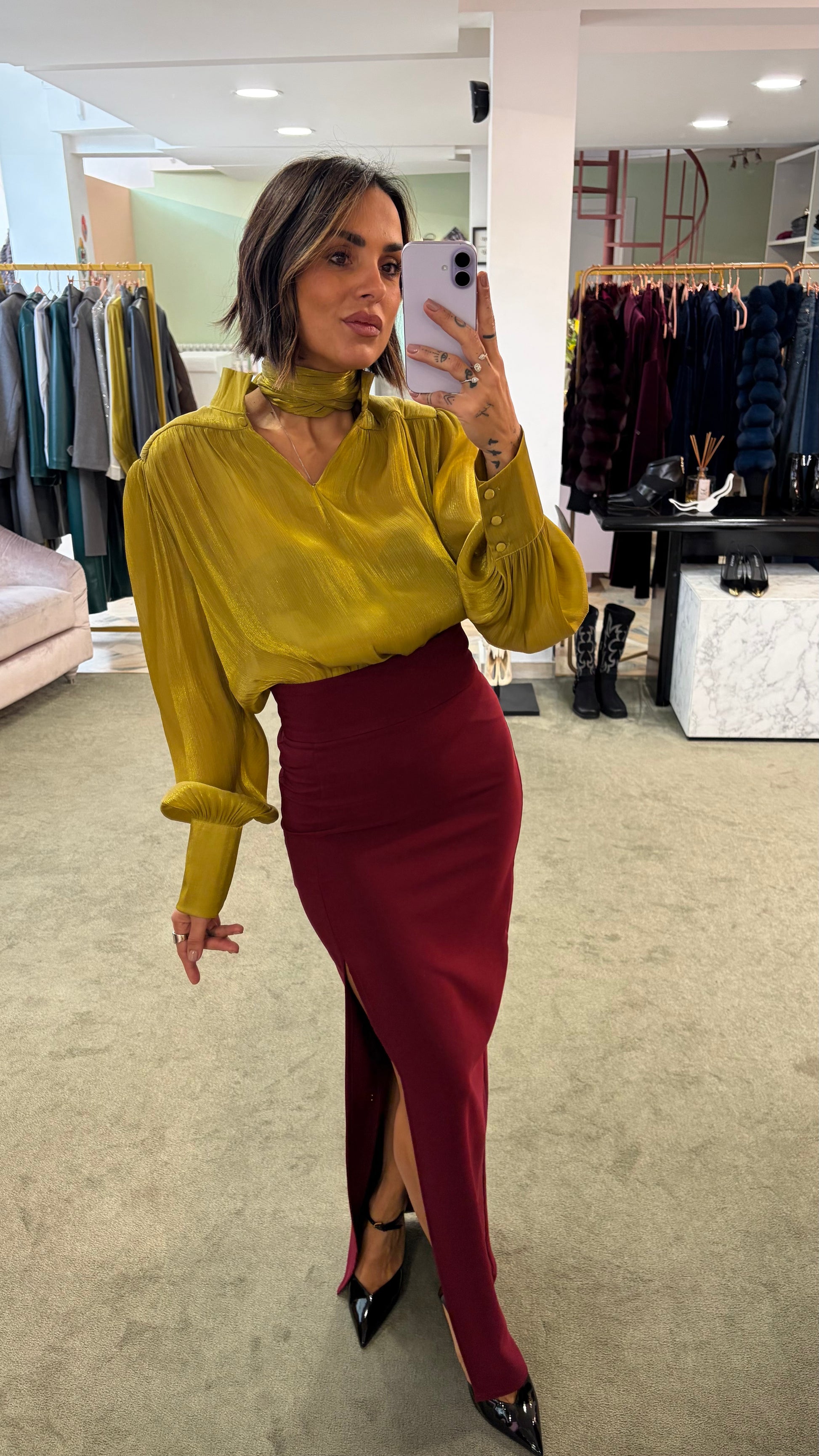 Vestibilità: regolare, effetto satin, con spallotte, manica palloncino e sciarpina