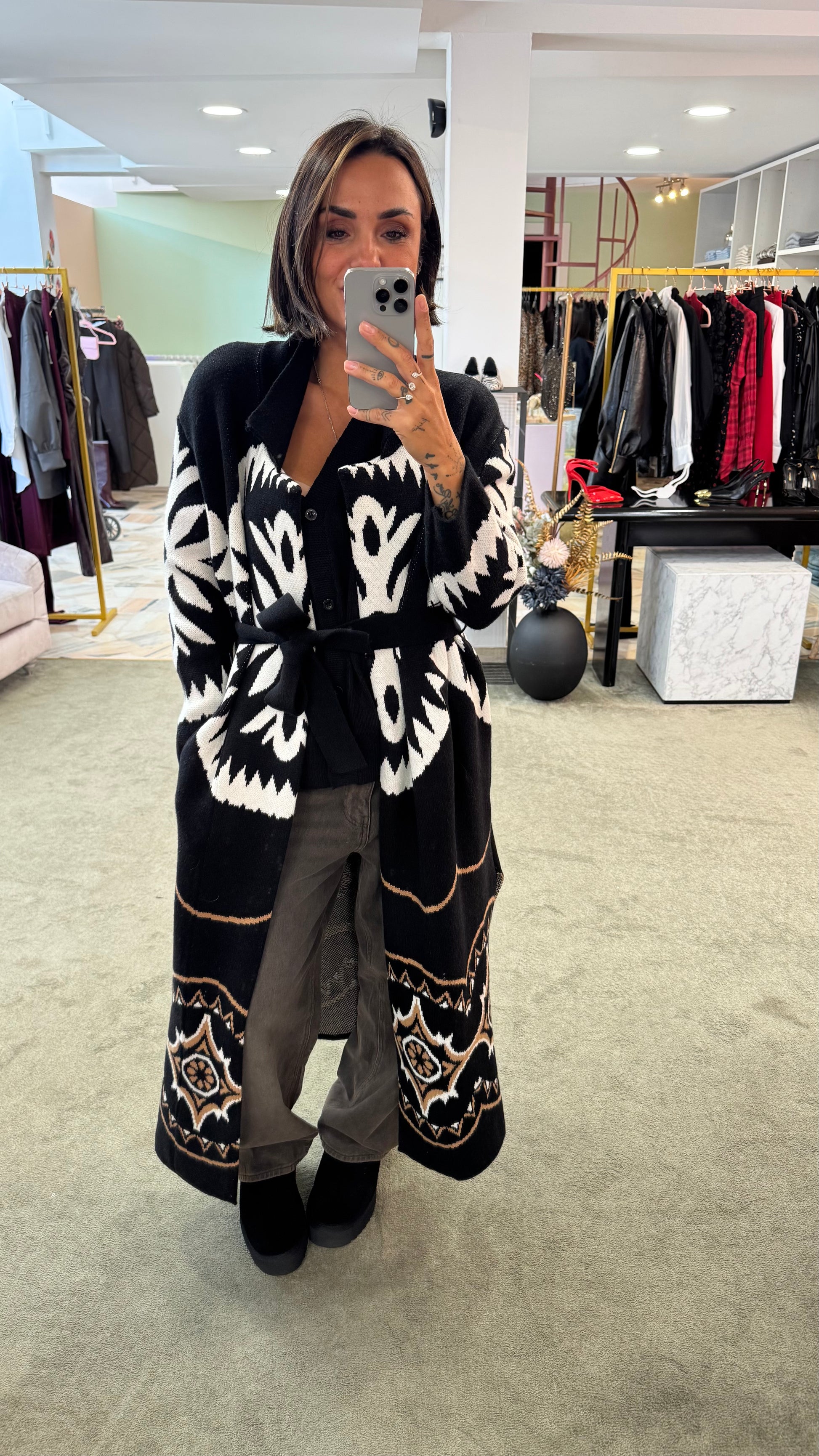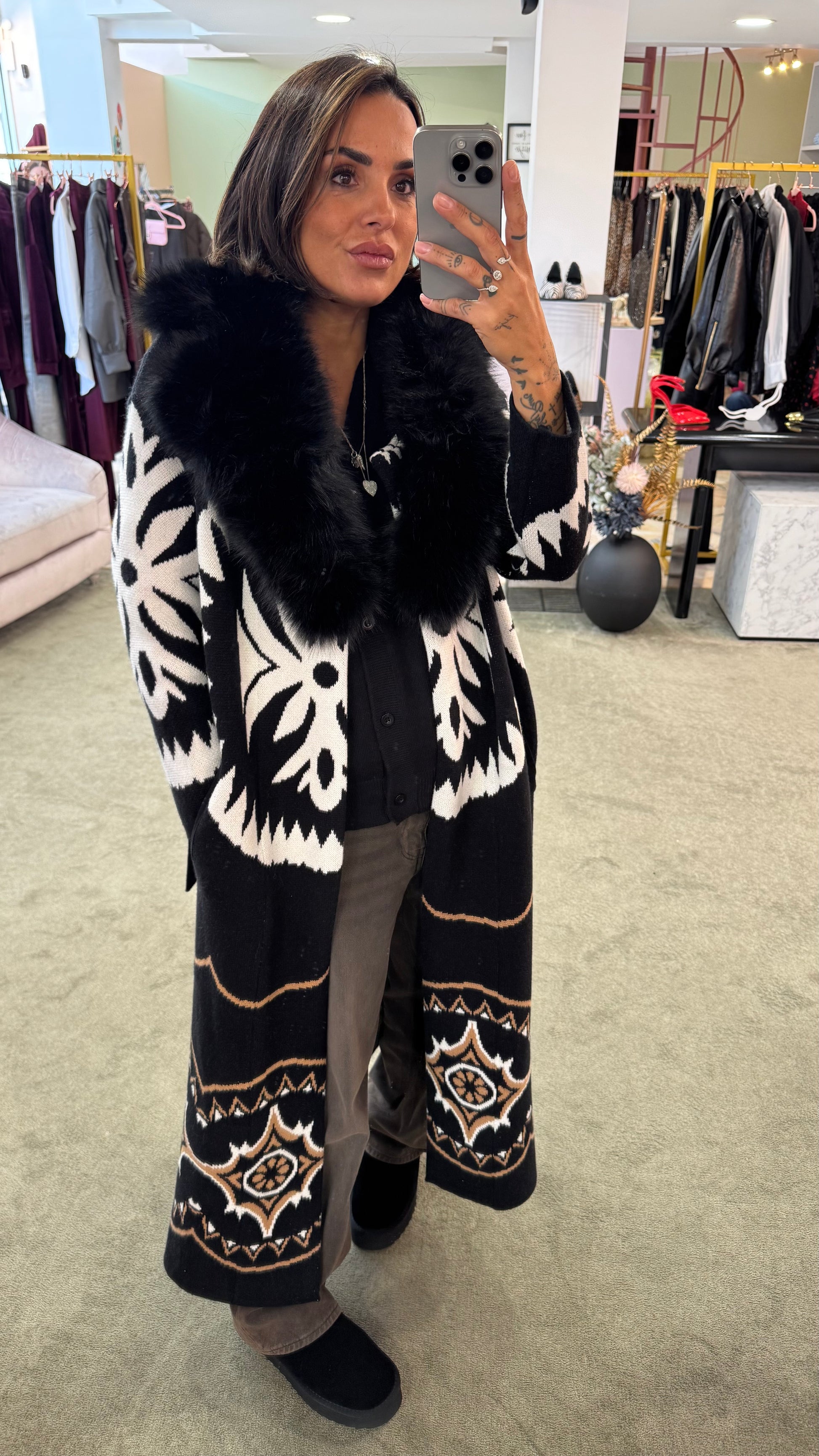 Cappotto/ Maxi cardigan nero lungo con collo in pelliccia eco
