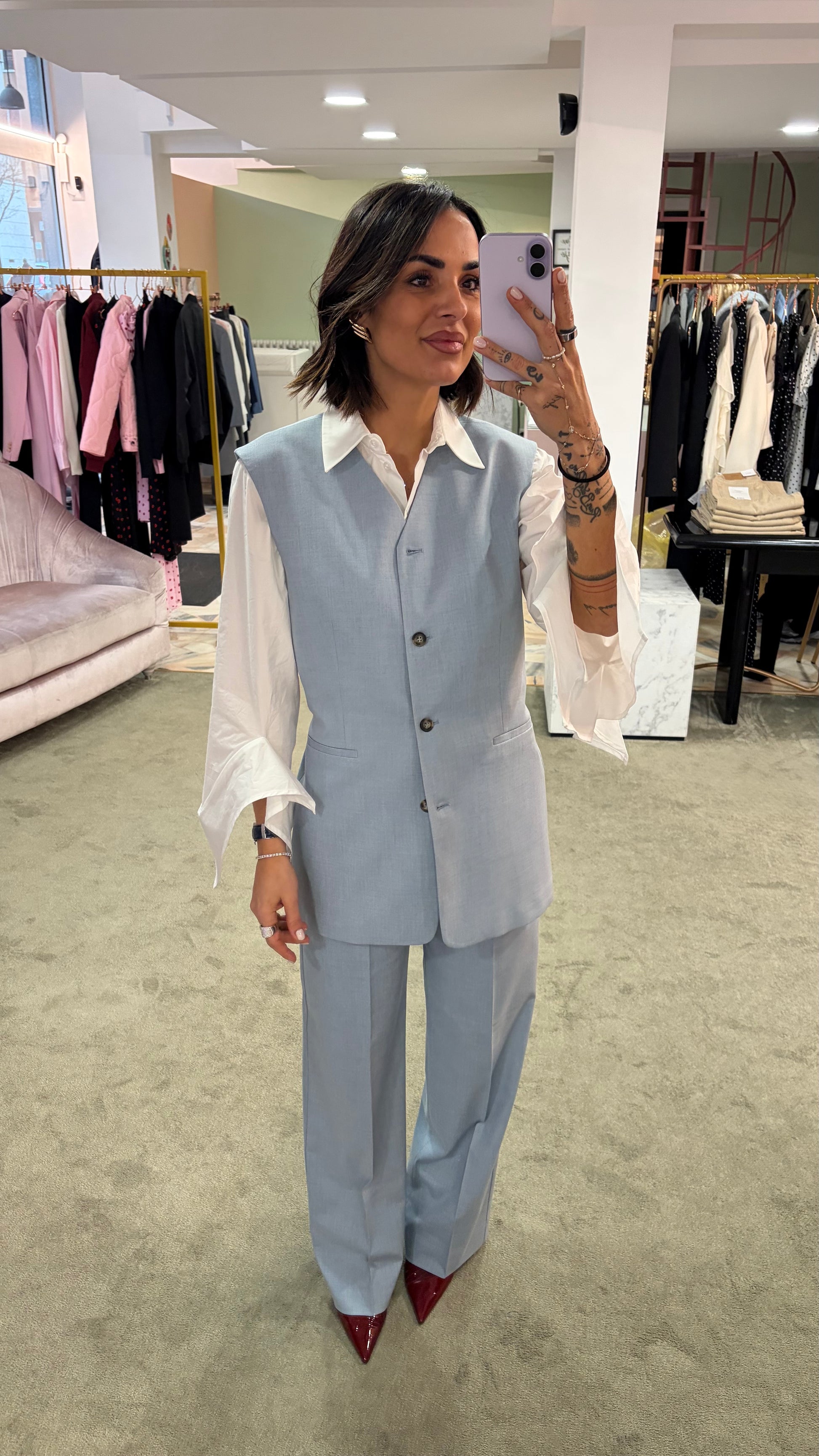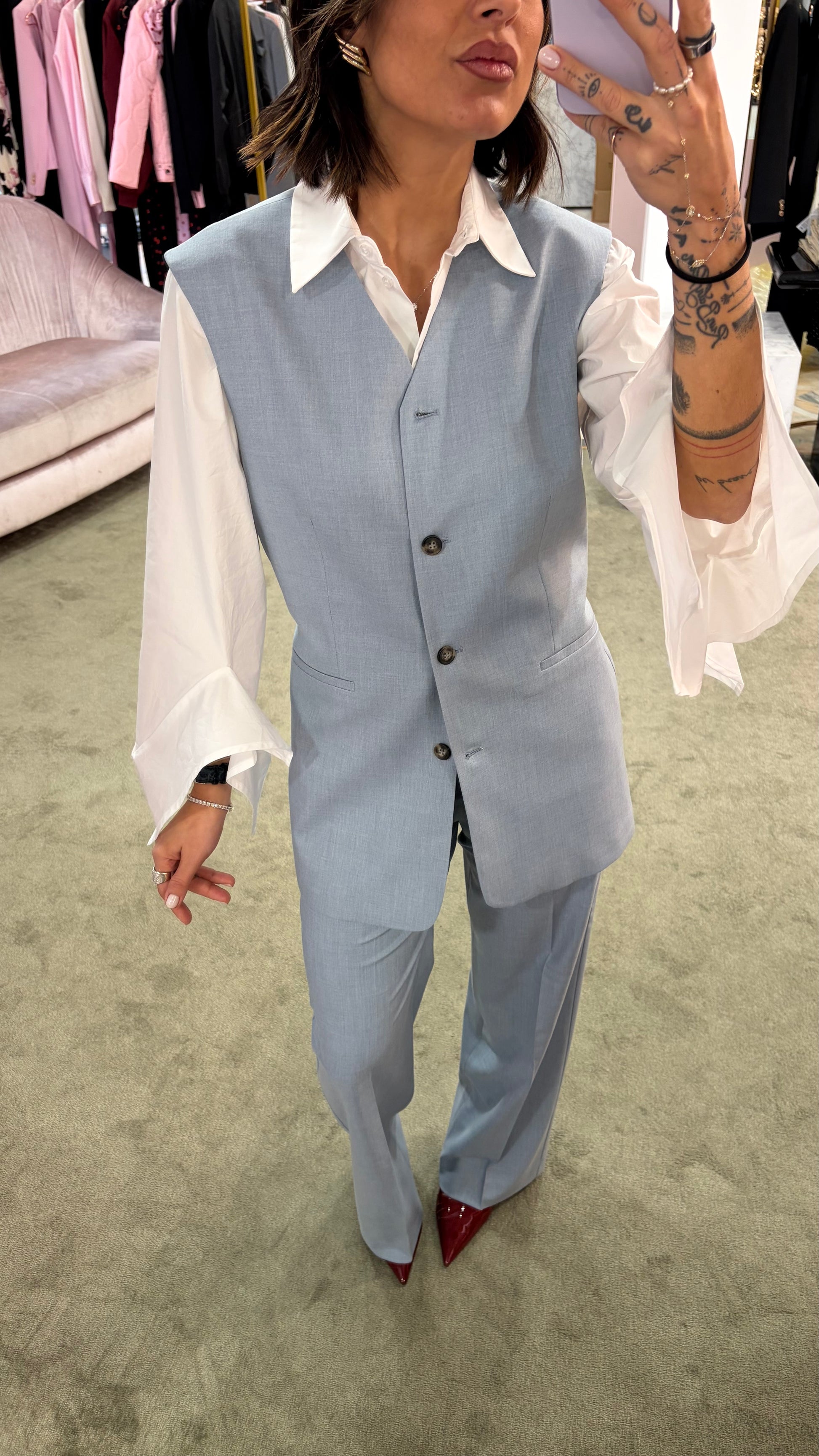 Gilet lungo azzurro effetto blazer con cinturina sl