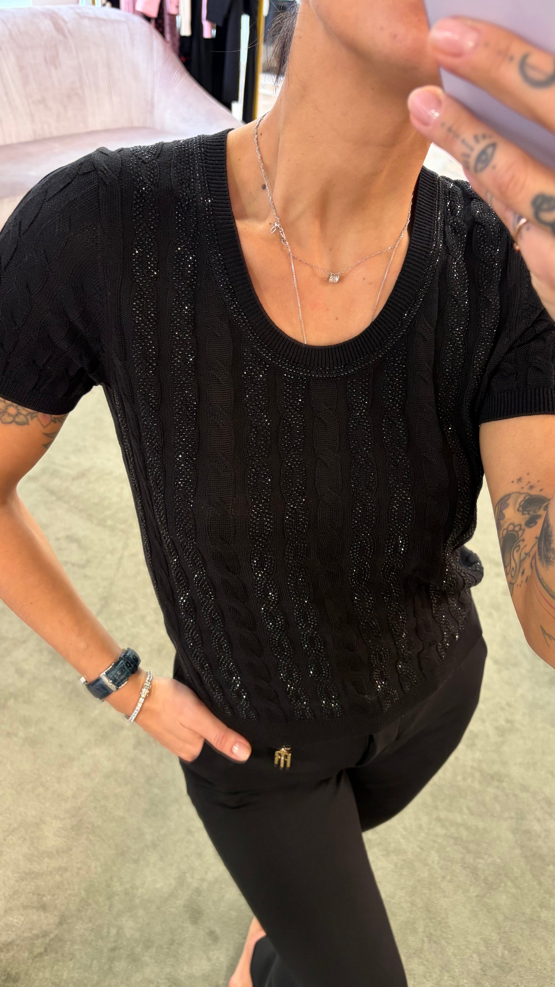 Maglia nera manica corta a trecce crystal fr