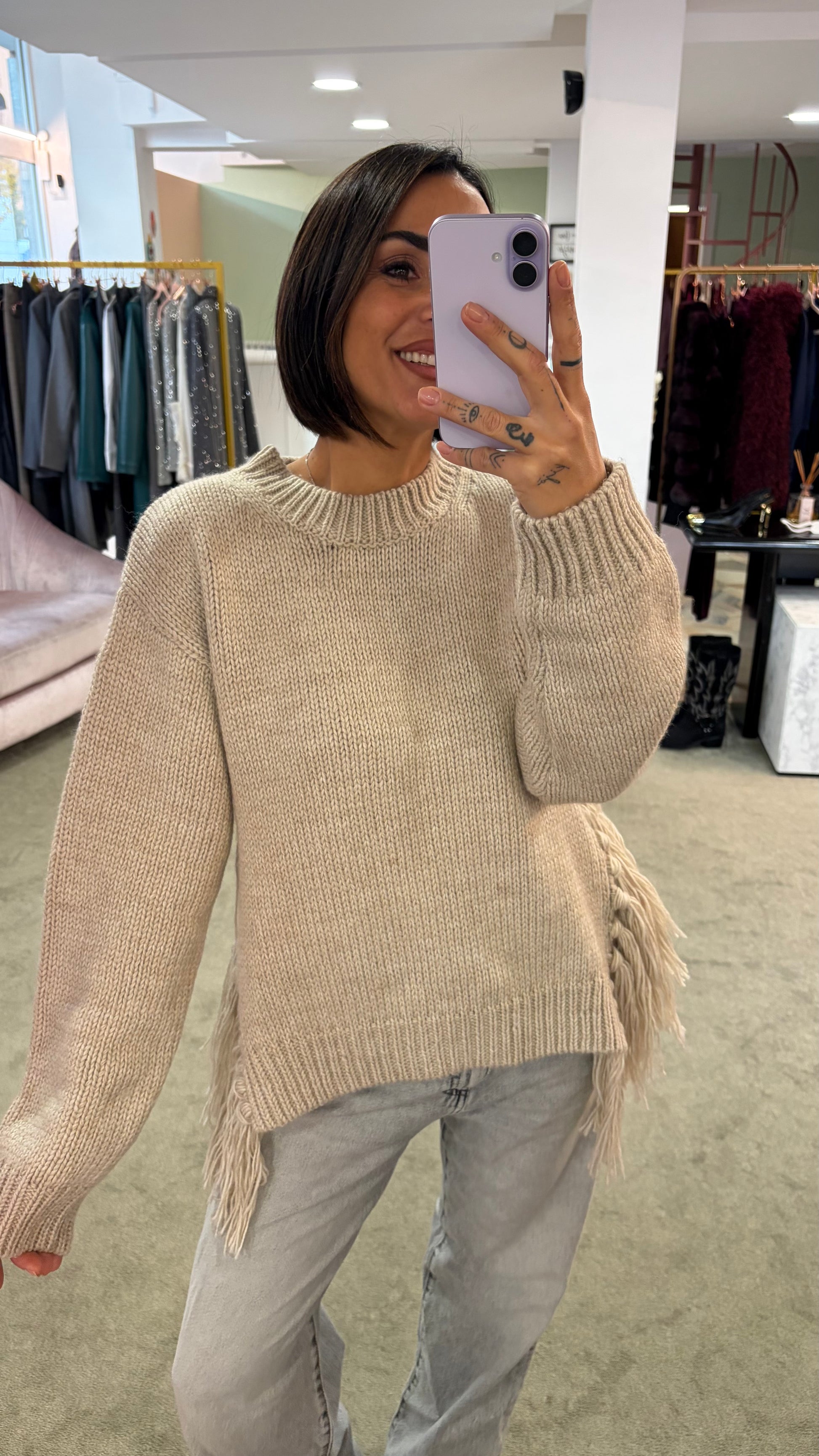 Maglione beige con frange laterali e spacco gl